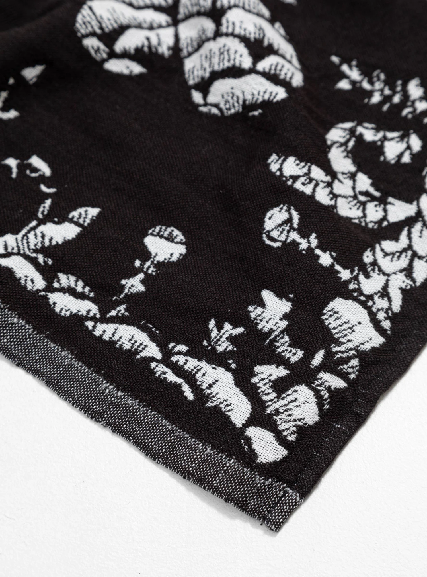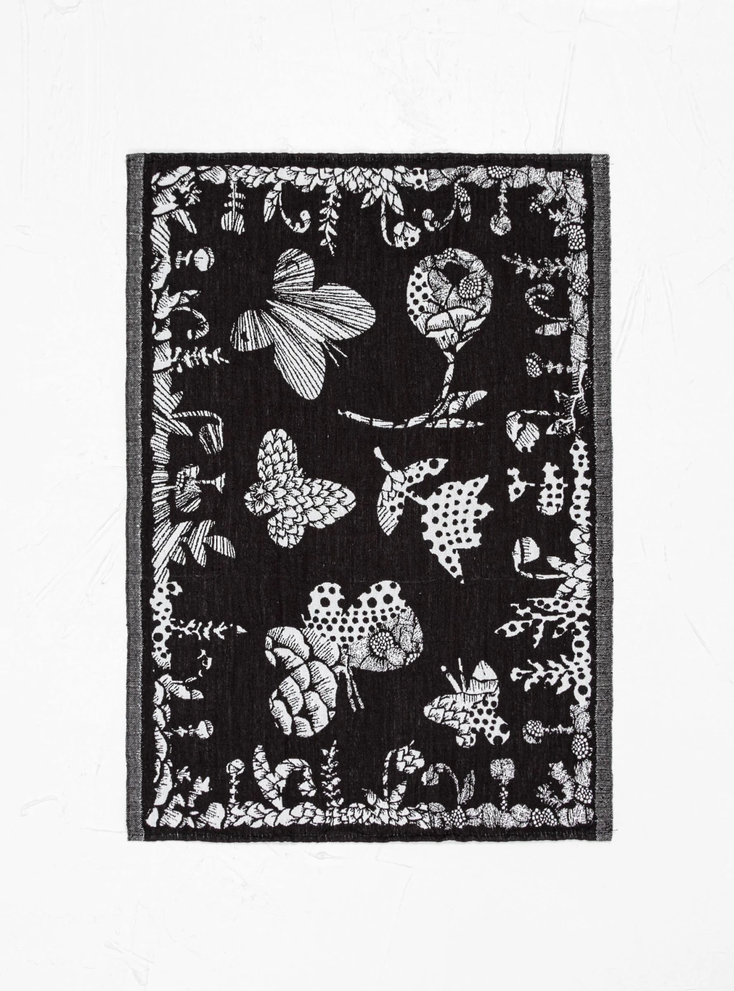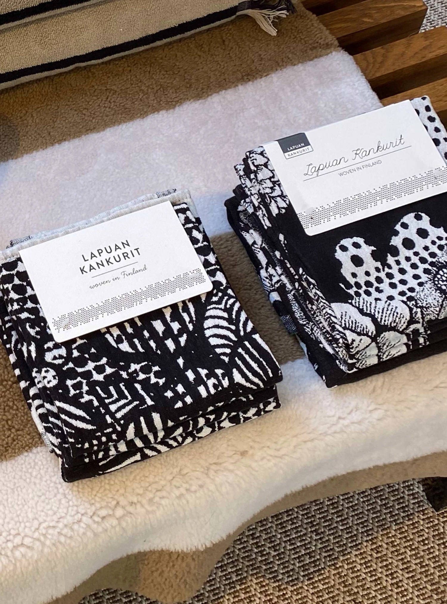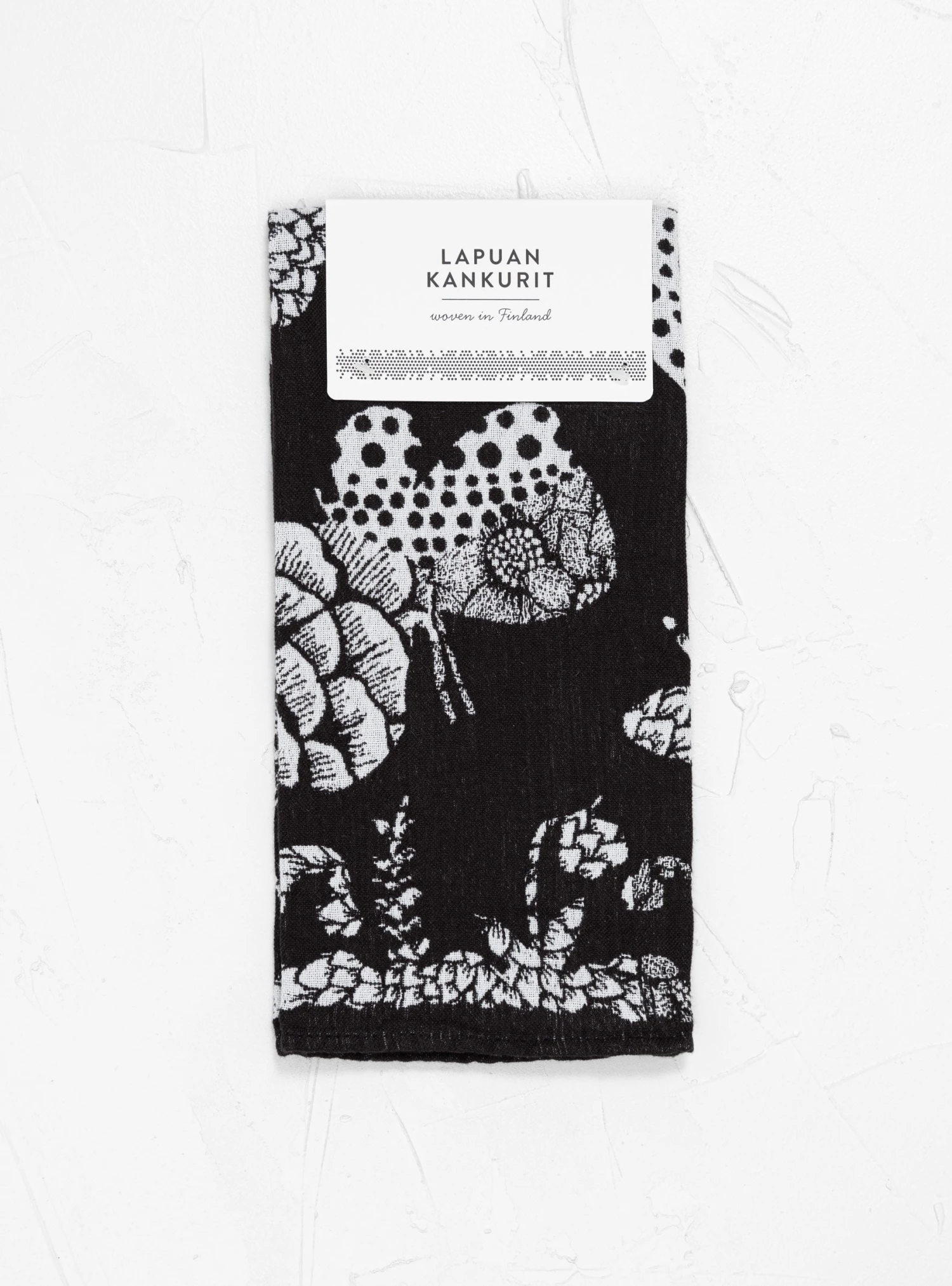 Featuring an intricate jacquard motif, this black and white Aamos tea towel from Lapuan Kankurit is made in Finland from an absorbent blend of washed cotton and linen.