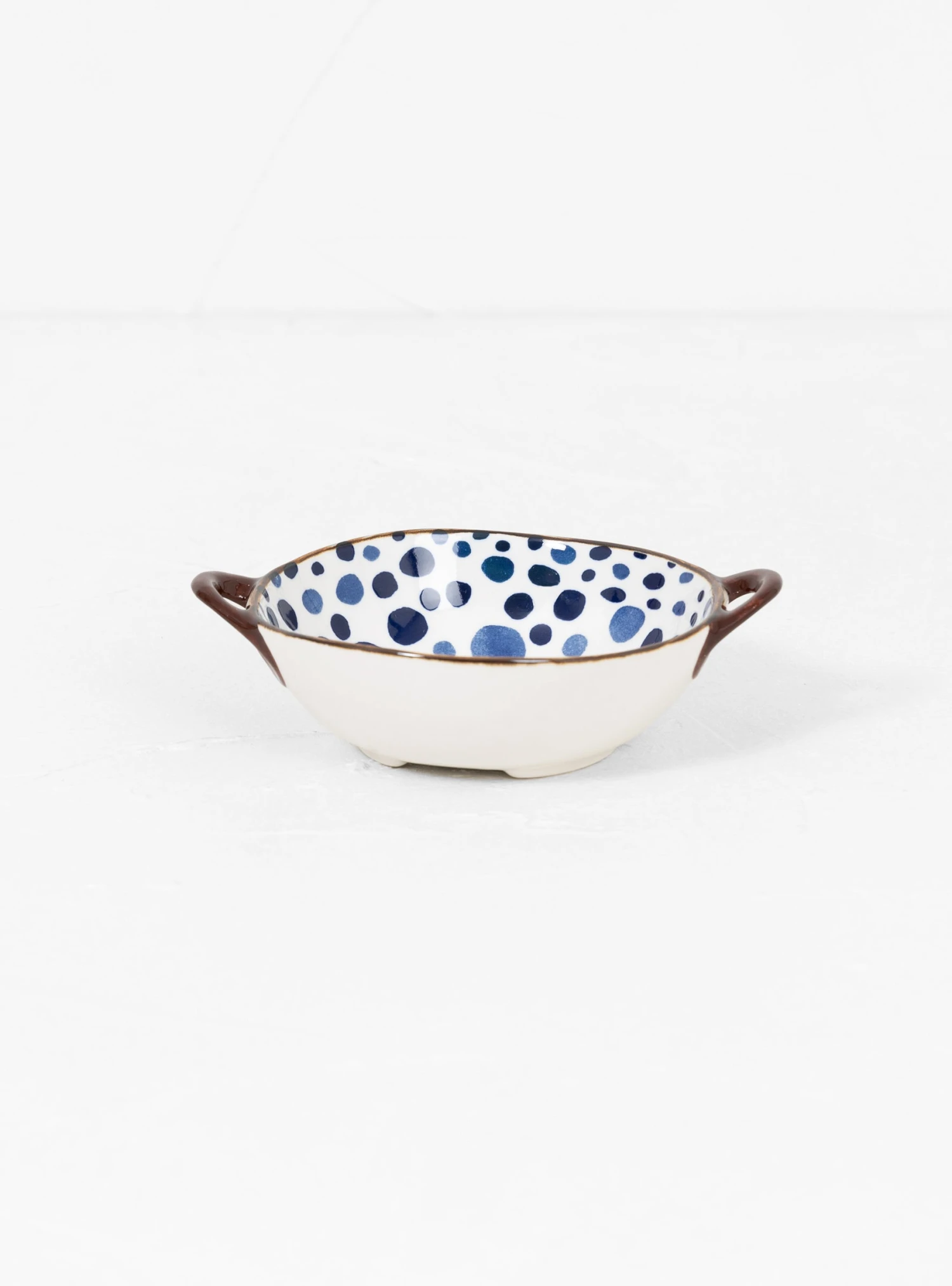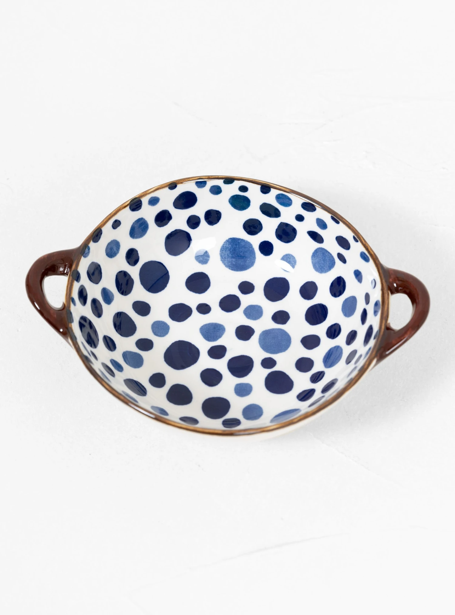 The Anafi Soup Bowl from Pomax comes in a white and blue colourway. The porcelain bowl is finished with a brown trim, brown handles and a blue spot detailing throughout the centre of the glazed bowl.
