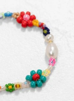 The Mexi Flower bracelet from Anni Lu is detailed with playful multi-coloured glass beads in the shape of flowers, which are handcrafted using the traditional Mexican Huichol technique. The brass bracelet is plated with 18-karat gold and is finished with a lobster clasp, as well as a freshwater pearl.