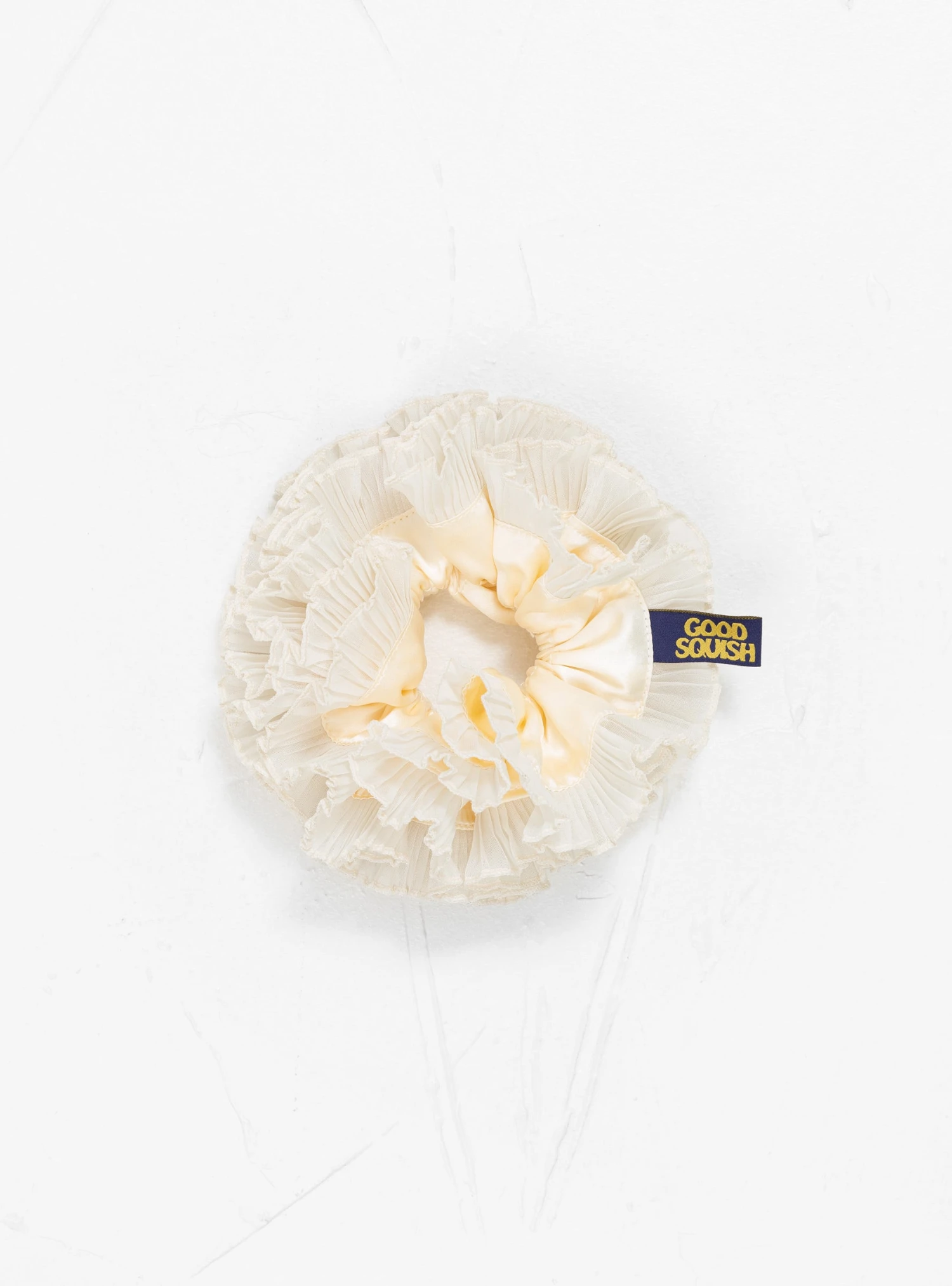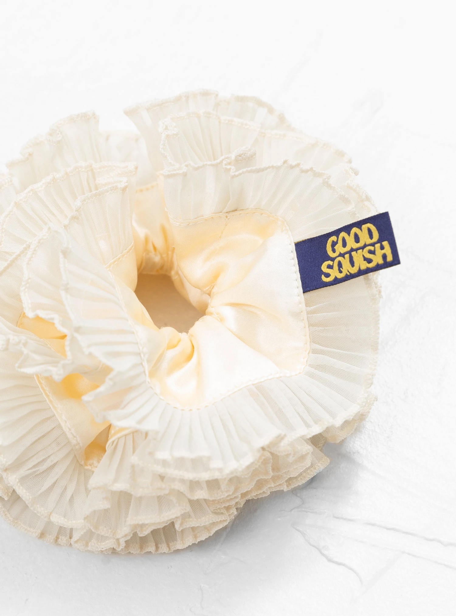 Good Squish sources deadstock fabrics from around the UK and Europe to create its range of hair scrunchies, including this B-e-a-utiful Baby Scrunchie design, handmade in London from a light cream silk with a delicate pleated trim.