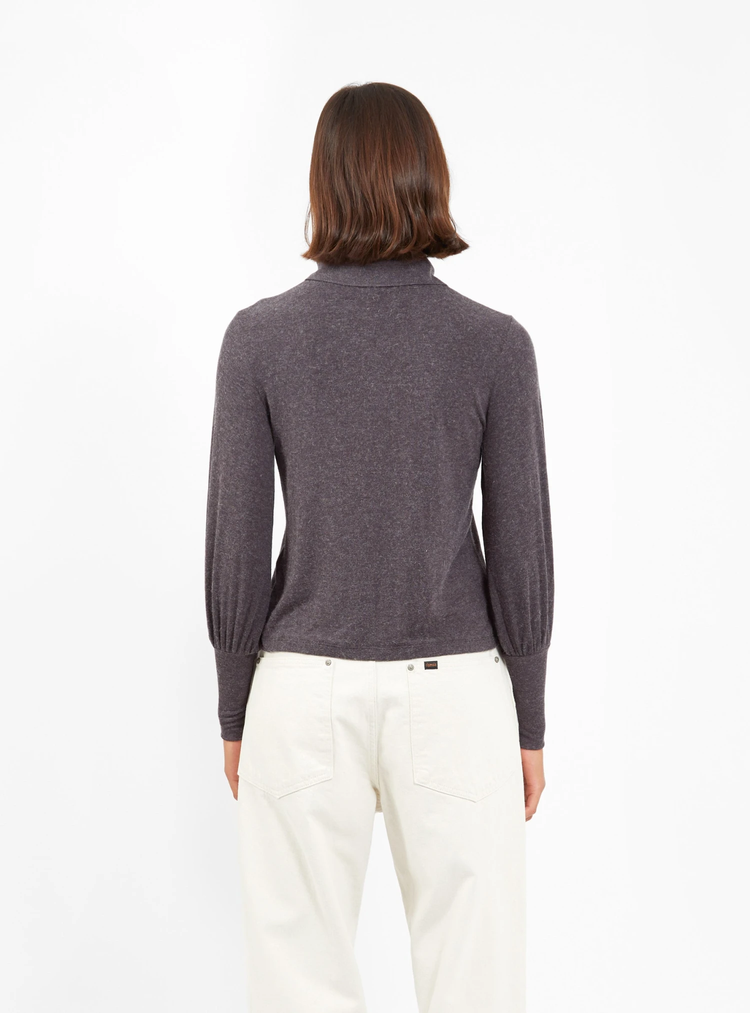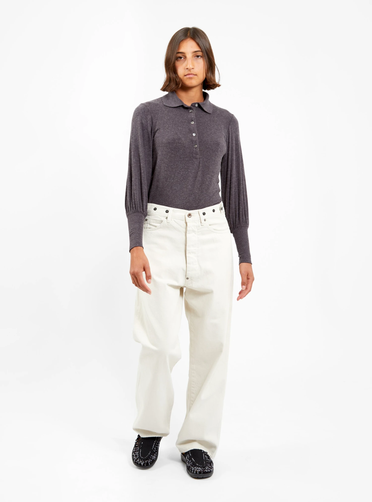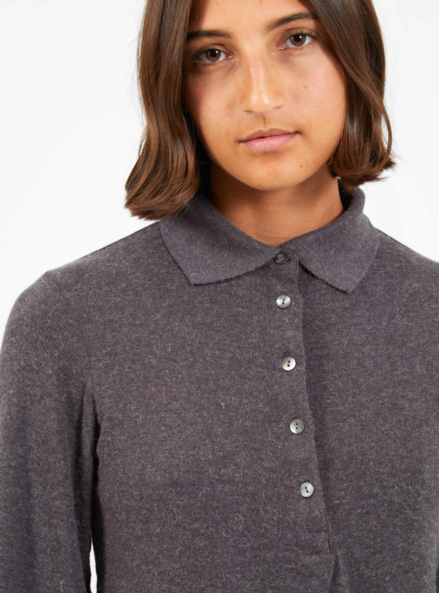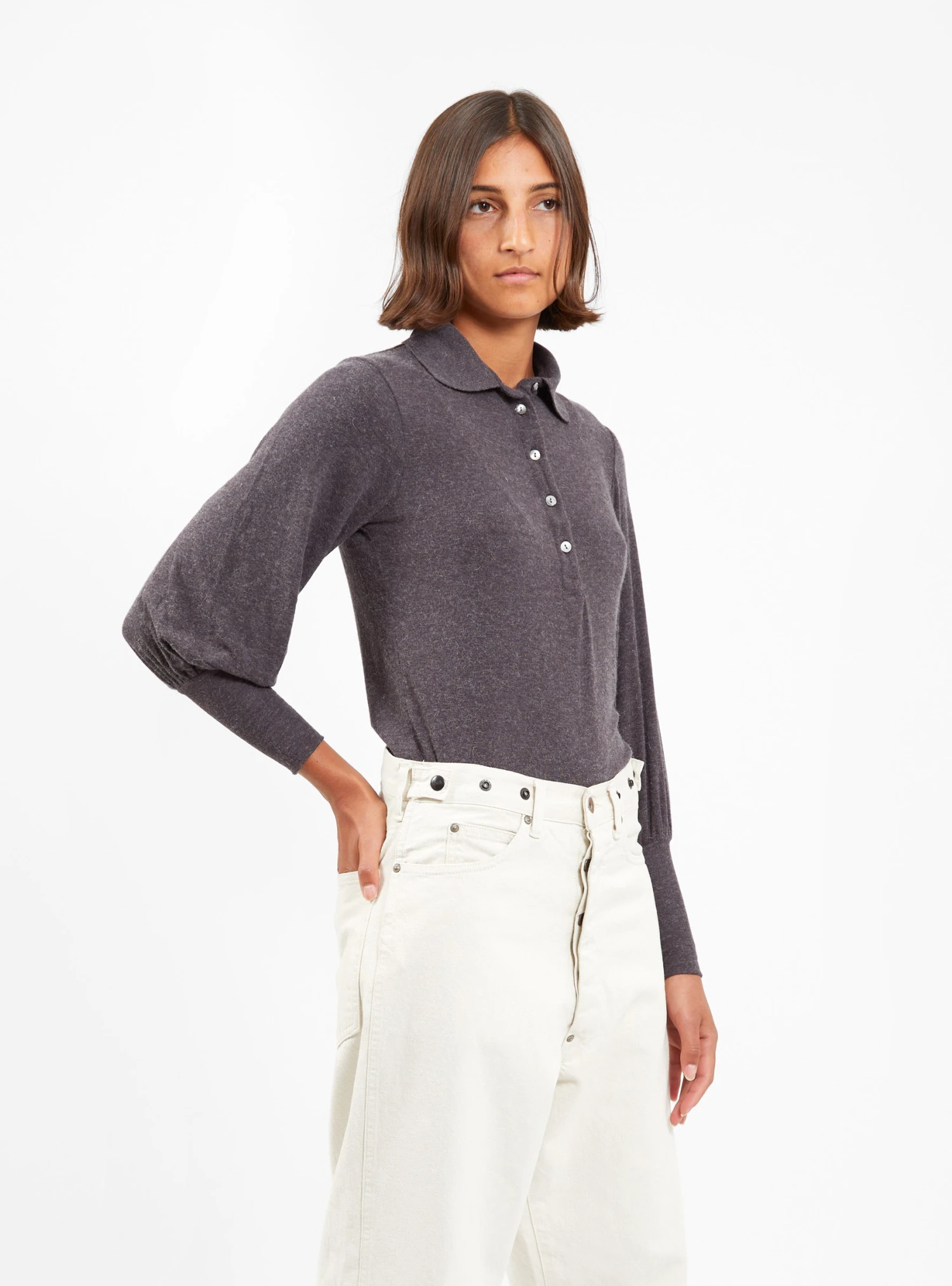 This grey Vidou polo top from Bellerose has puffed sleeves with elongated ribbed cuffs for a touch of drama. Made in Portugal with an element of angora and a touch of stretch, it’s knitted to a form-fitting silhouette and punctuated with mother-of-pearl buttons fastening the front.