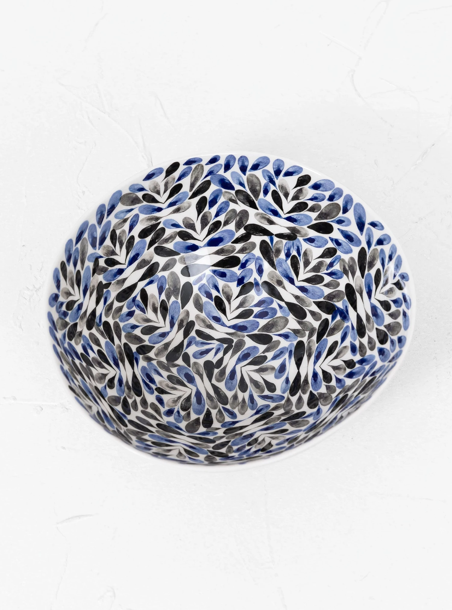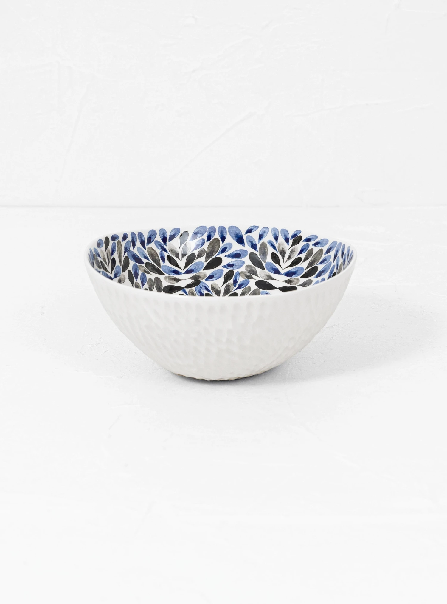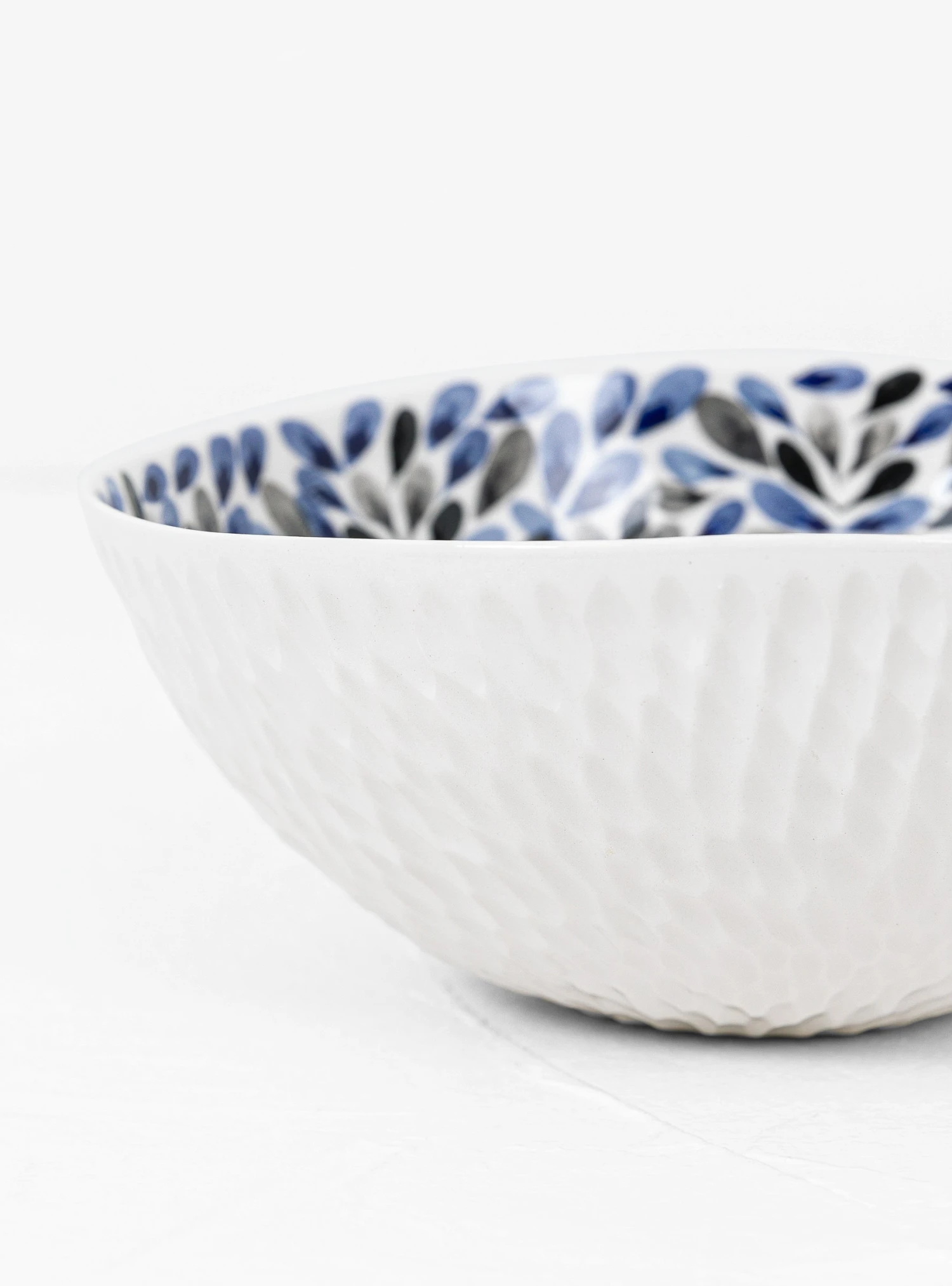 Crafted in the artisan’s rural Lithuanian studio, Aida Dirse’s Black and Blue Leaves Bowl n69 is formed from white clay, hand-painted with under-glaze pigments and finished with a softly dimpled outer and a clear glaze. This bowl is painted with black and blue leaves.