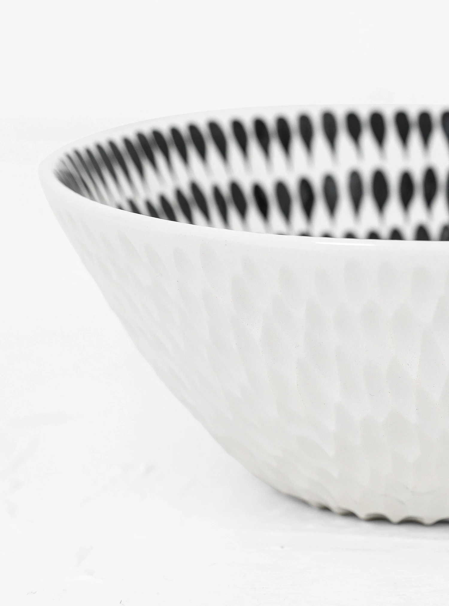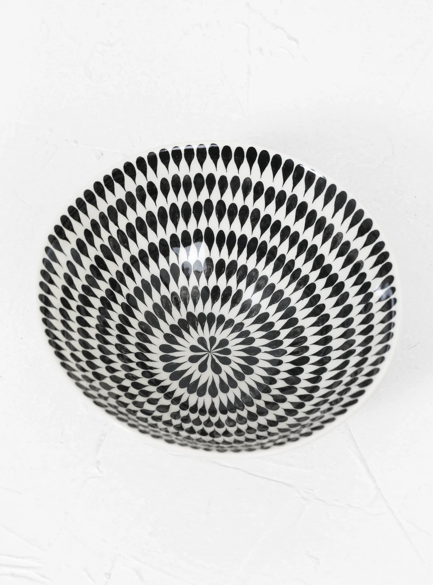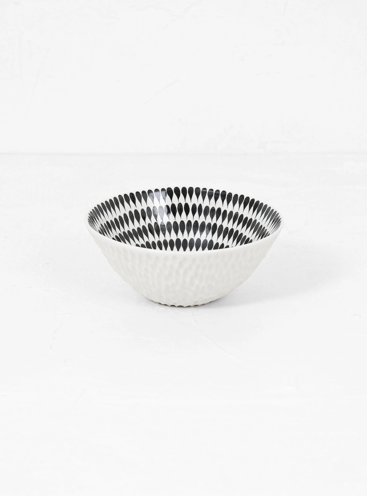 Crafted in the artisan’s rural Lithuanian studio, Aida Dirse’s Black Drops Bowl n58 is formed from white clay, hand-painted with under-glaze pigments and finished with a softly dimpled outer and a clear glaze. This bowl is painted with a series of black drops.