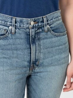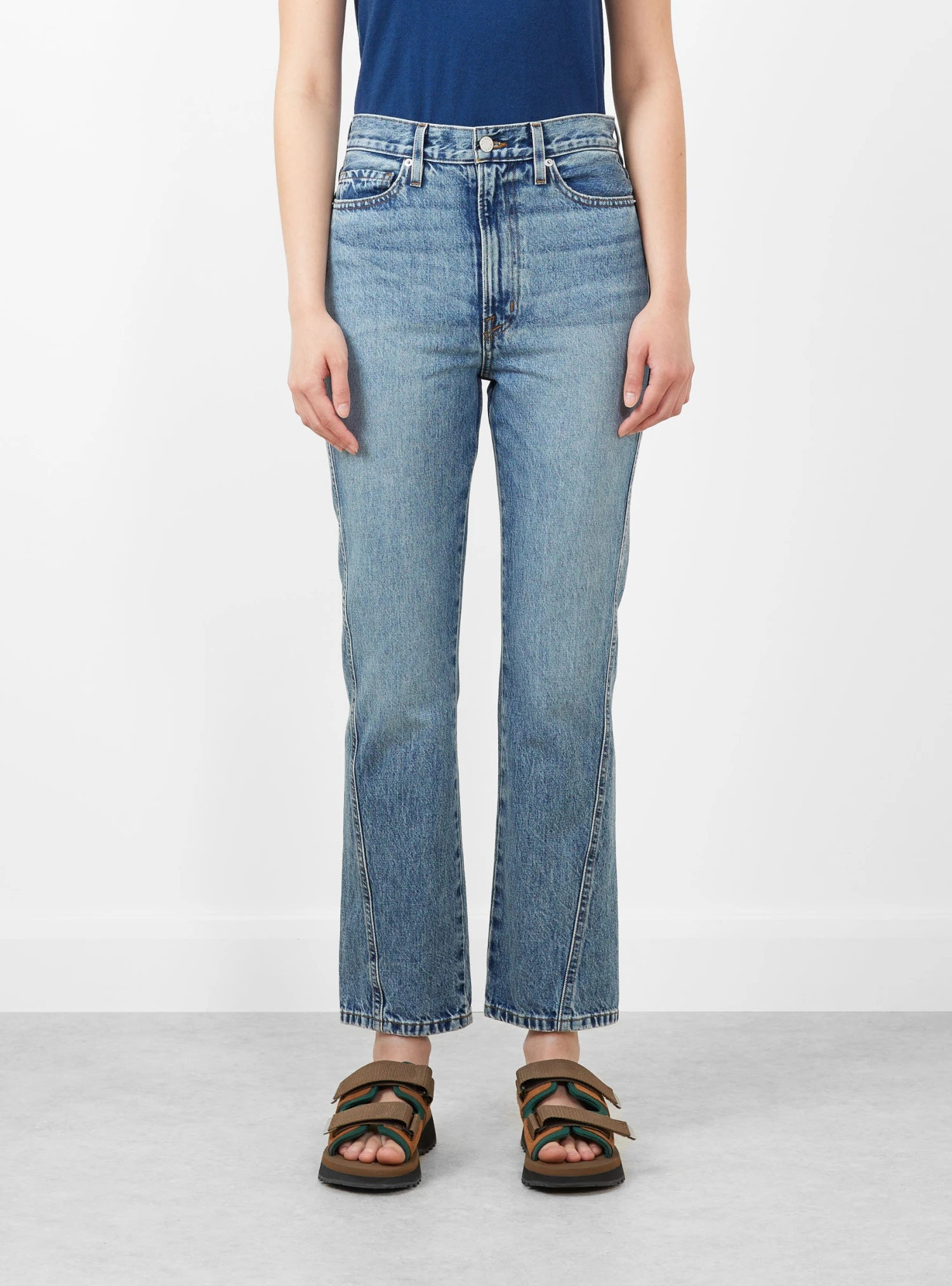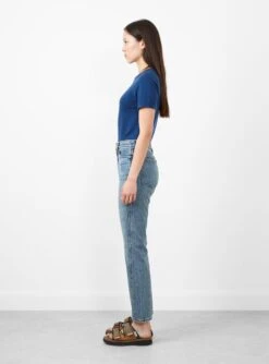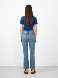 Crafted from 100% regenerative cotton in Los Angeles California, these light blue jeans feature a ultra high rise, slim fit, a slight kick flare and a forward side seam.