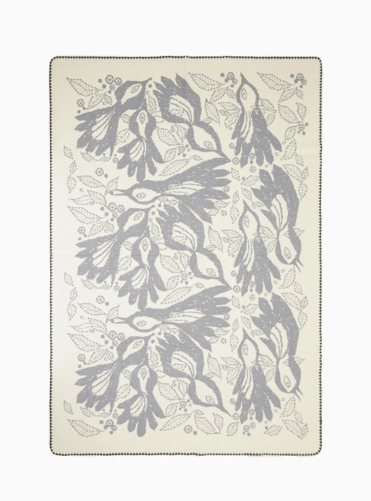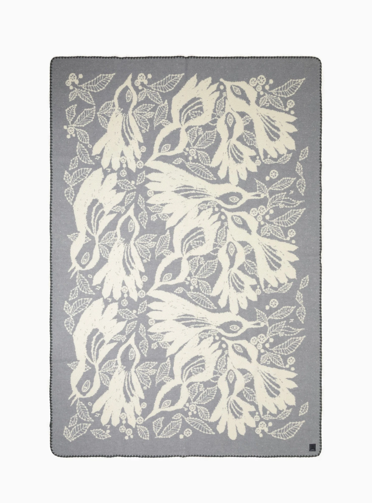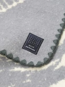 This grey Carnival blanket from Minä Perhonen is made in Japan from soft wool jacquard, meaning it can be presented two ways depending on your mood, and finished with hand-stitched edges.
