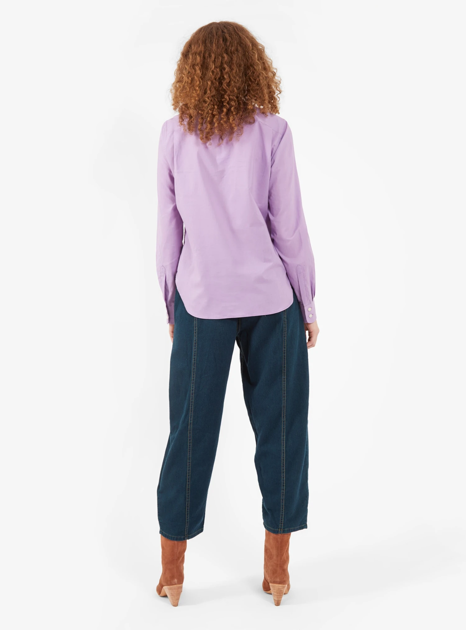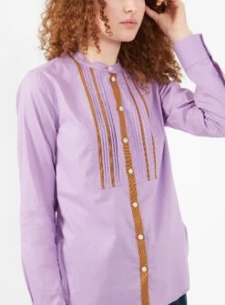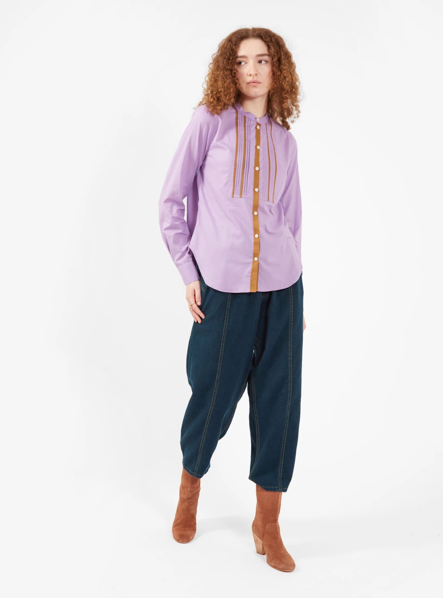 Rachel Comey may have taken inspiration from tailored tuxedo shirts, but you don’t just have to wear the Conduit Top to dinner. This button-up is made from lightweight cotton mousseline in lilac, detailed with a classic grandad collar, a curved hem and a pleated front with highlights of complimentary burnt orange. Style it down and tuck it into a pair of high-rise, wide-leg trousers and heeled Chelsea boots.