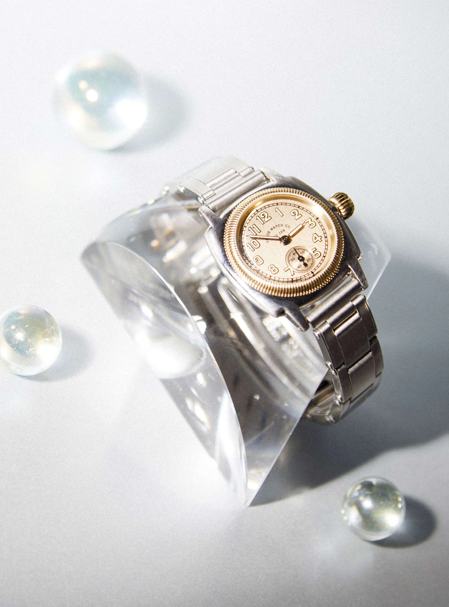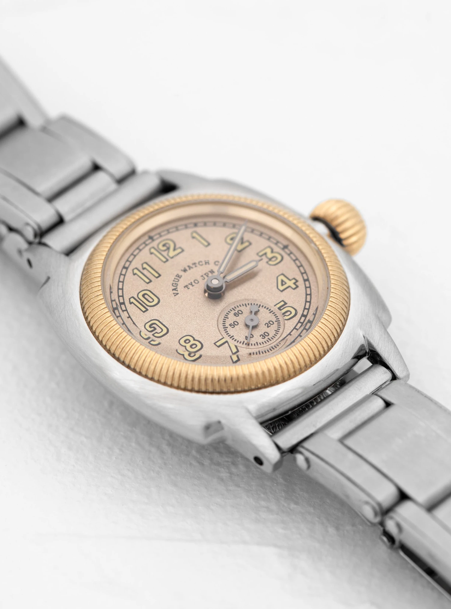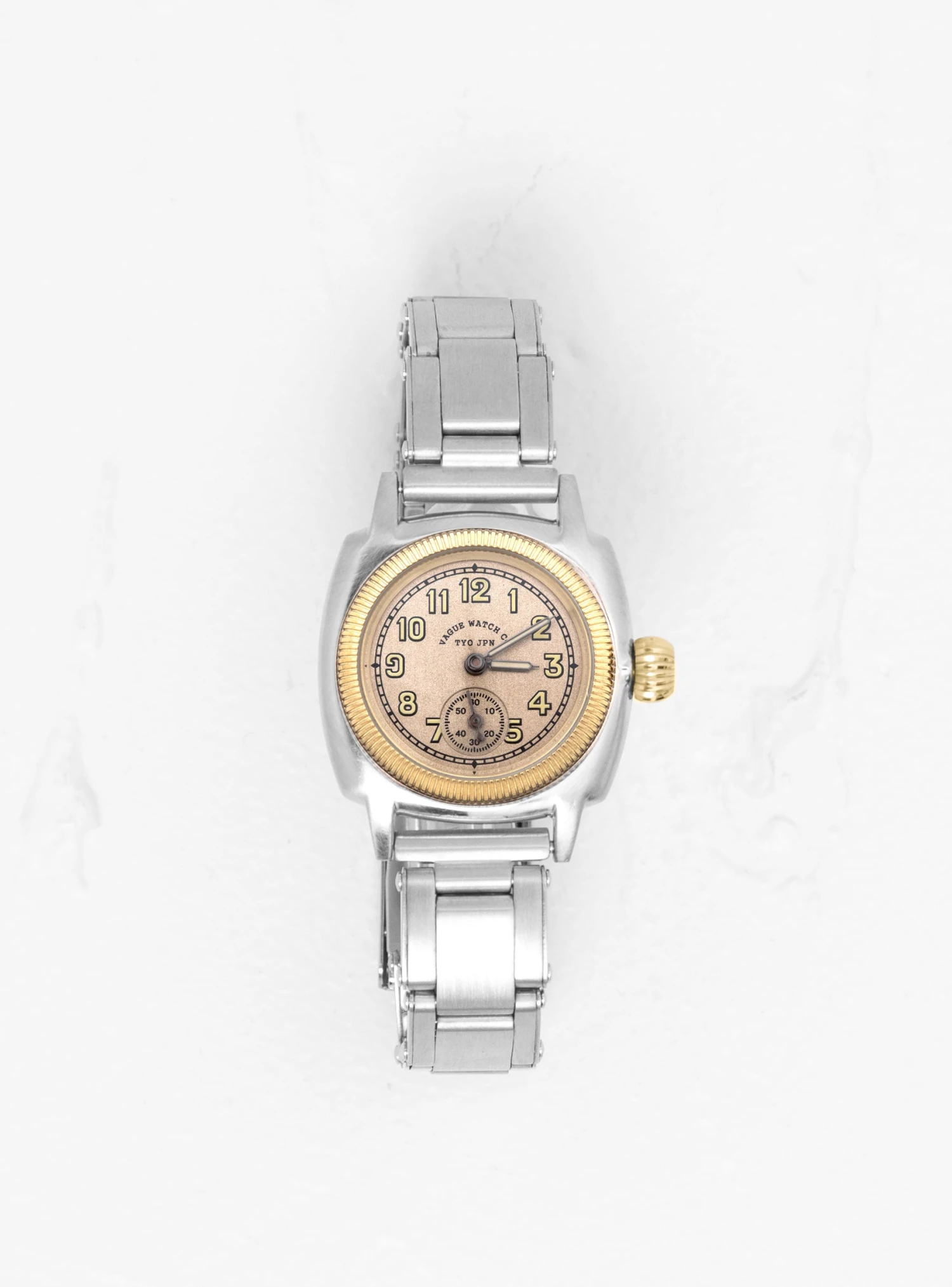 Made from silver-tone stainless steel with gold-tone accents, this Coussin Early watch from Vague Watch Co. features Japanese quartz movement and domed hard crystal glass.