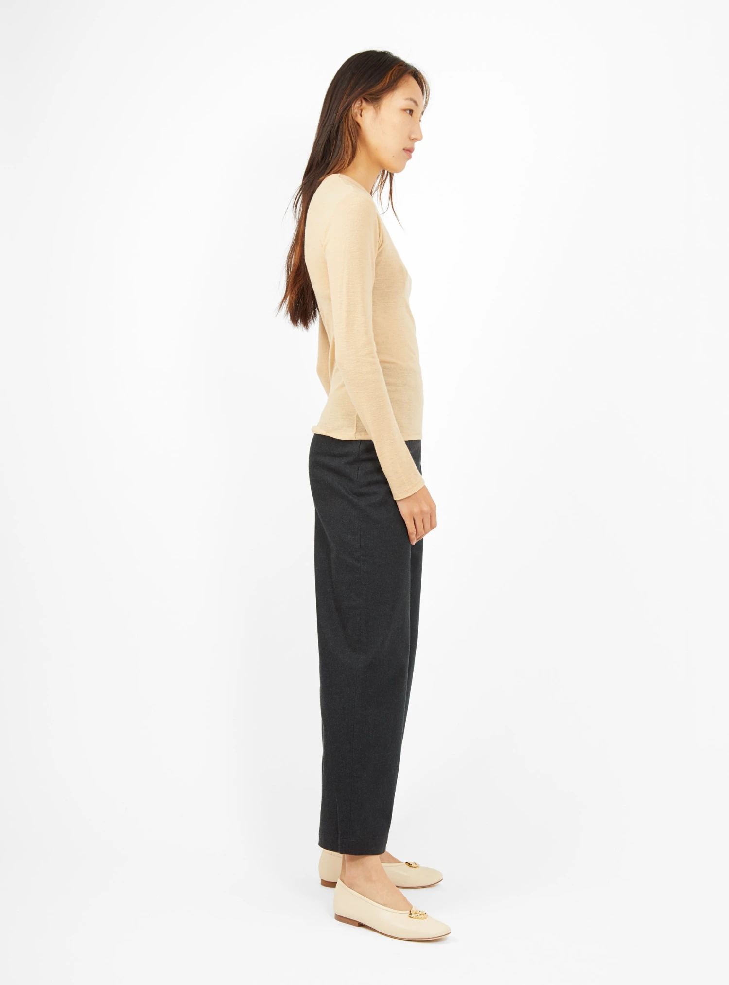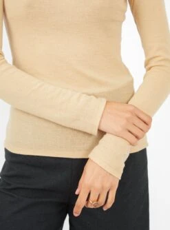 This beige Drive Long Sleeve Tee from Baserange is cut to a body-forming silhouette with a round neck. Made from the softest wool that regulates according to the temperature, this the perfect layer for the new season.