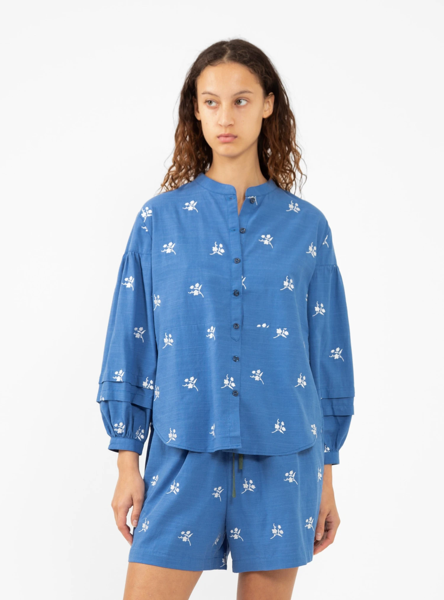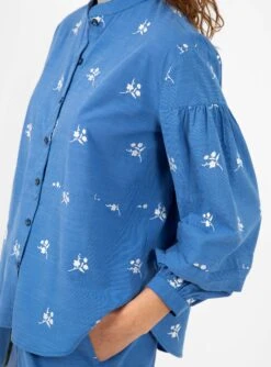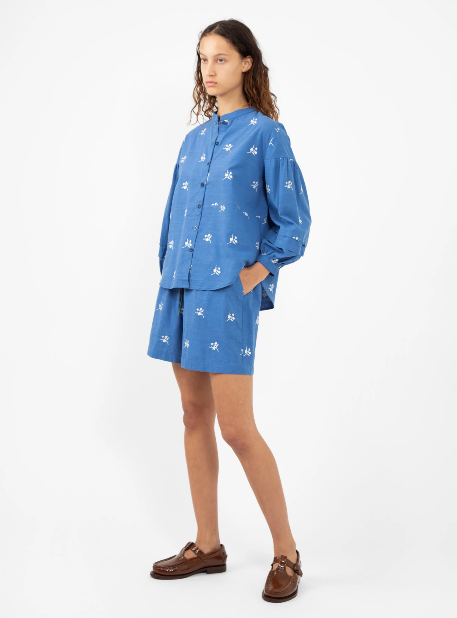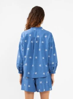 Made from a blend of linen and cotton, this blue and white floral-embroidered Essie blouse from Sideline is cut to a relaxed silhouette with dropped shoulders and a mandarin collar.