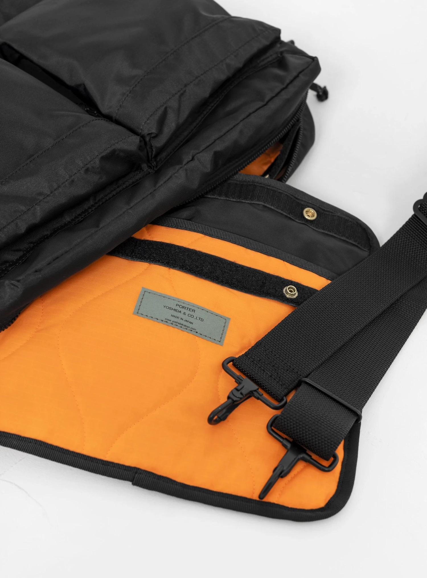 The black FORCE shoulder bag from Porter Yoshida & Co. takes inspiration from MA-1 flight jackets, with the bold orange lining being the most obvious reference. Made in Japan from padded nylon twill, it features two zipped outer pockets and suspends from a long, adjustable strap that can also be styled across the body.
