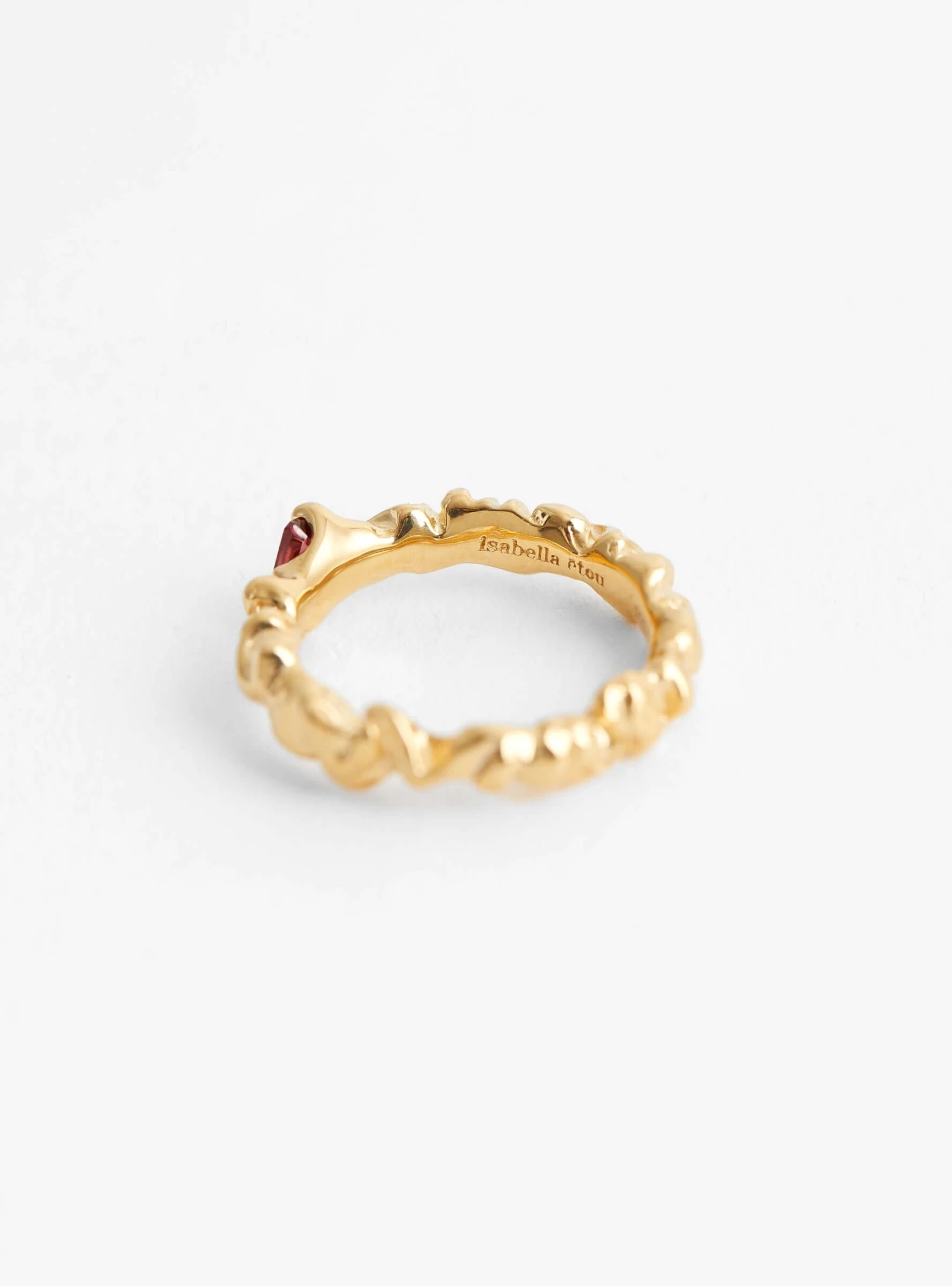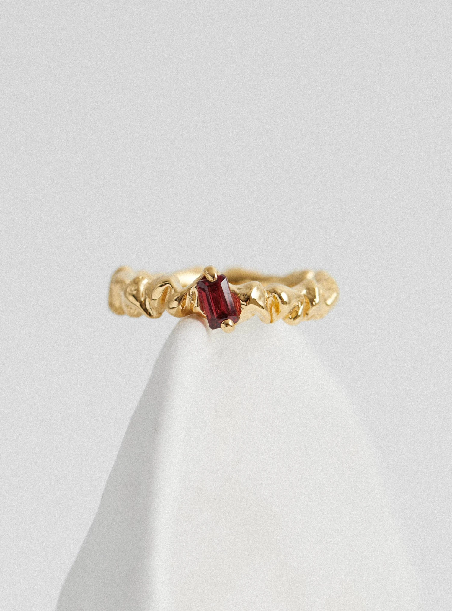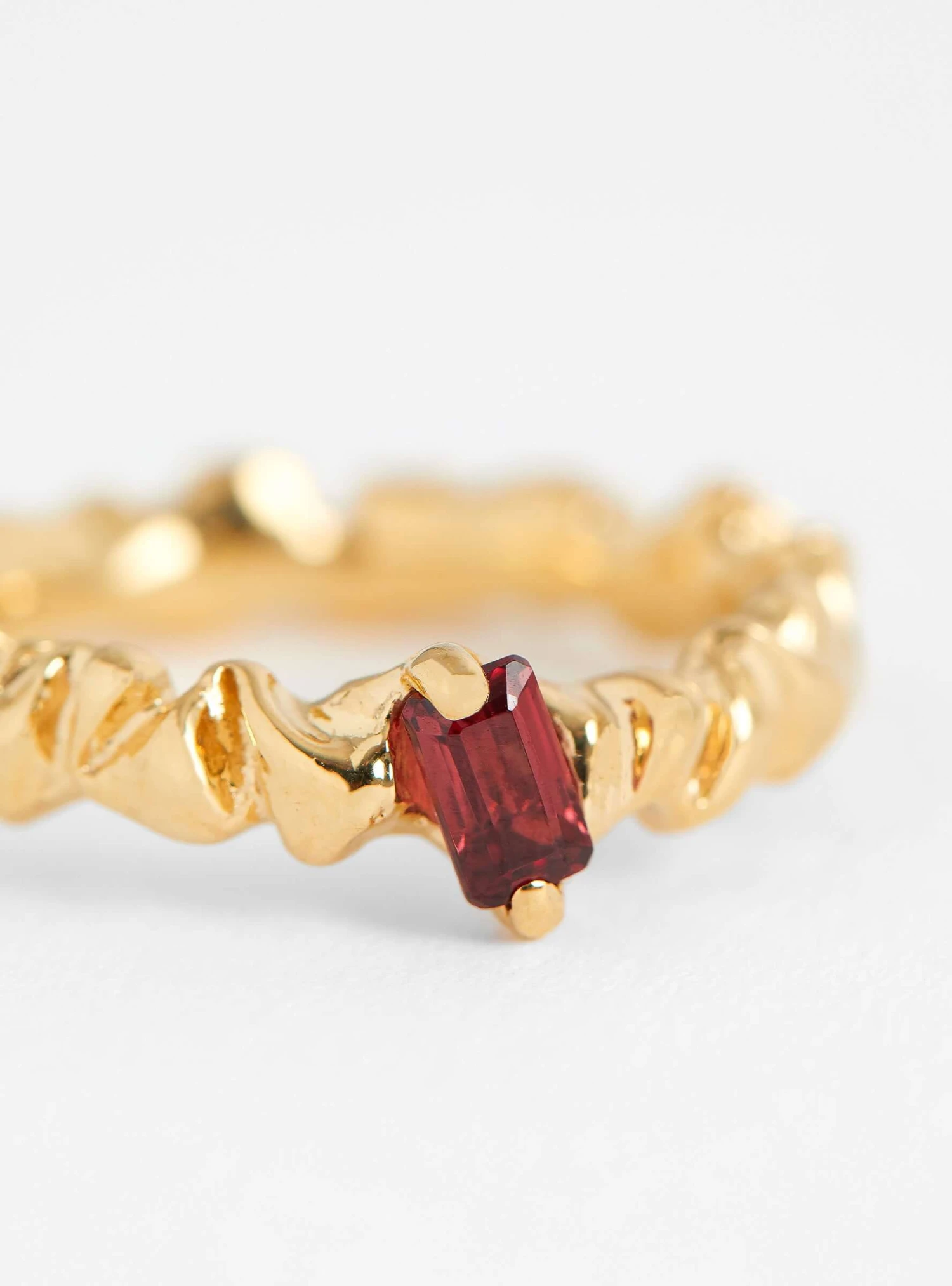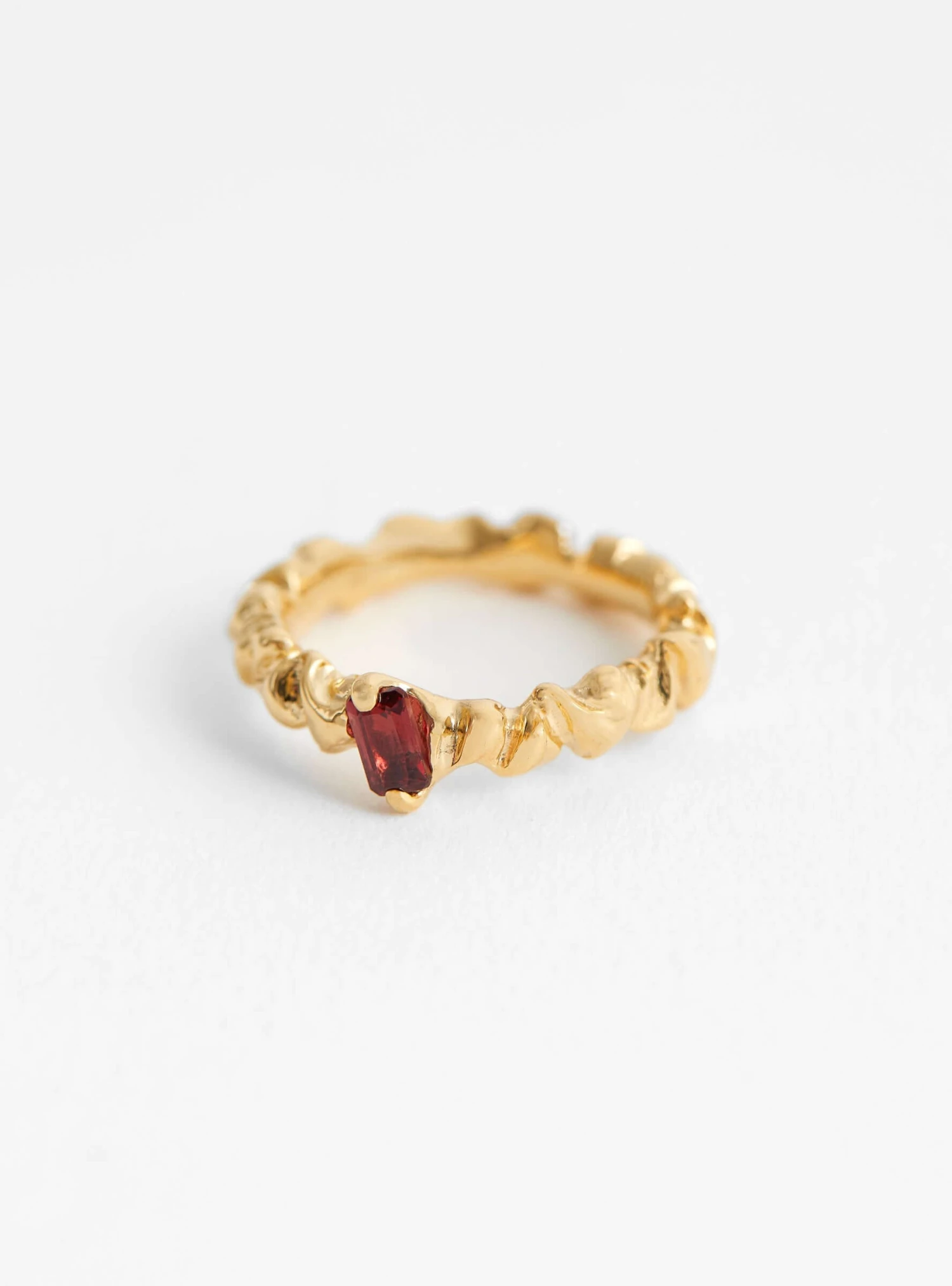 The Garnet Crinkle Thin Ring from Isabella Etou arrives in a gold vermeil with a small stone of Garnet at the centre. The design draws from natural lines in its crinkle design.