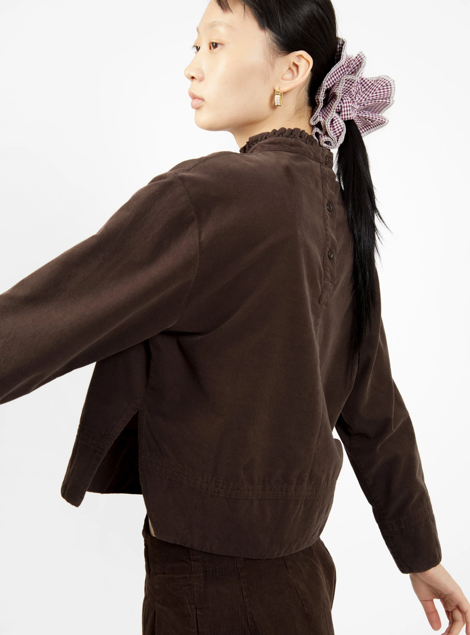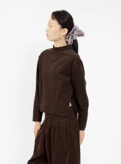 Finished in the season’s earthy brown hue, this Gia shirt from YMC will slot effortlessly into your autumnal wardrobe. Made from organic-cotton corduroy, it’s cut to a slightly relaxed silhouette with a frill-trimmed high neckline and dropped shoulders, and fastens via three corozo buttons at the beck.