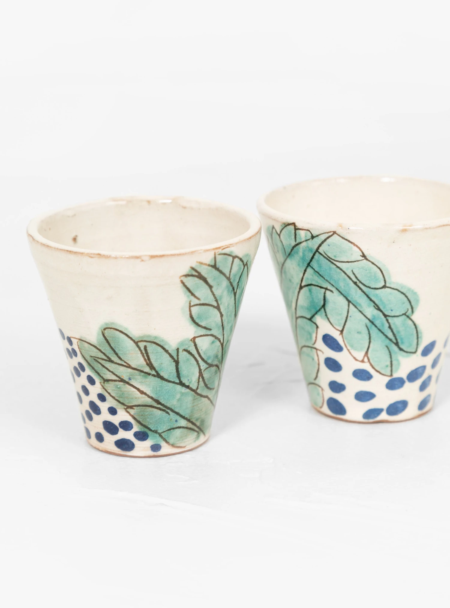Malaika enlists highly skilled Egyptian artisans to create its range of homeware, including these white Green Leaves espresso cups, handcrafted from clay by a potter in the oasis village of Tunis, Fayoum.