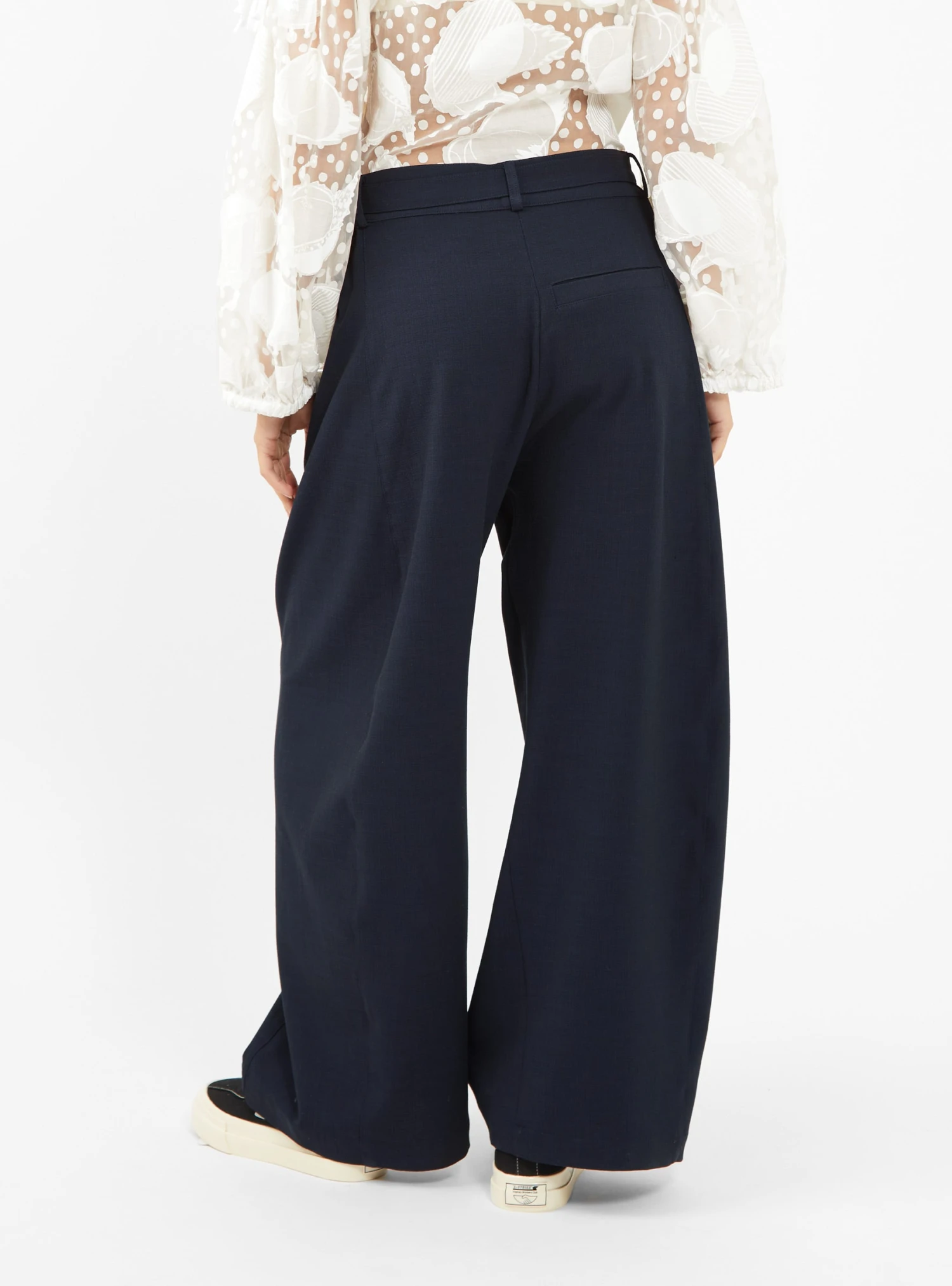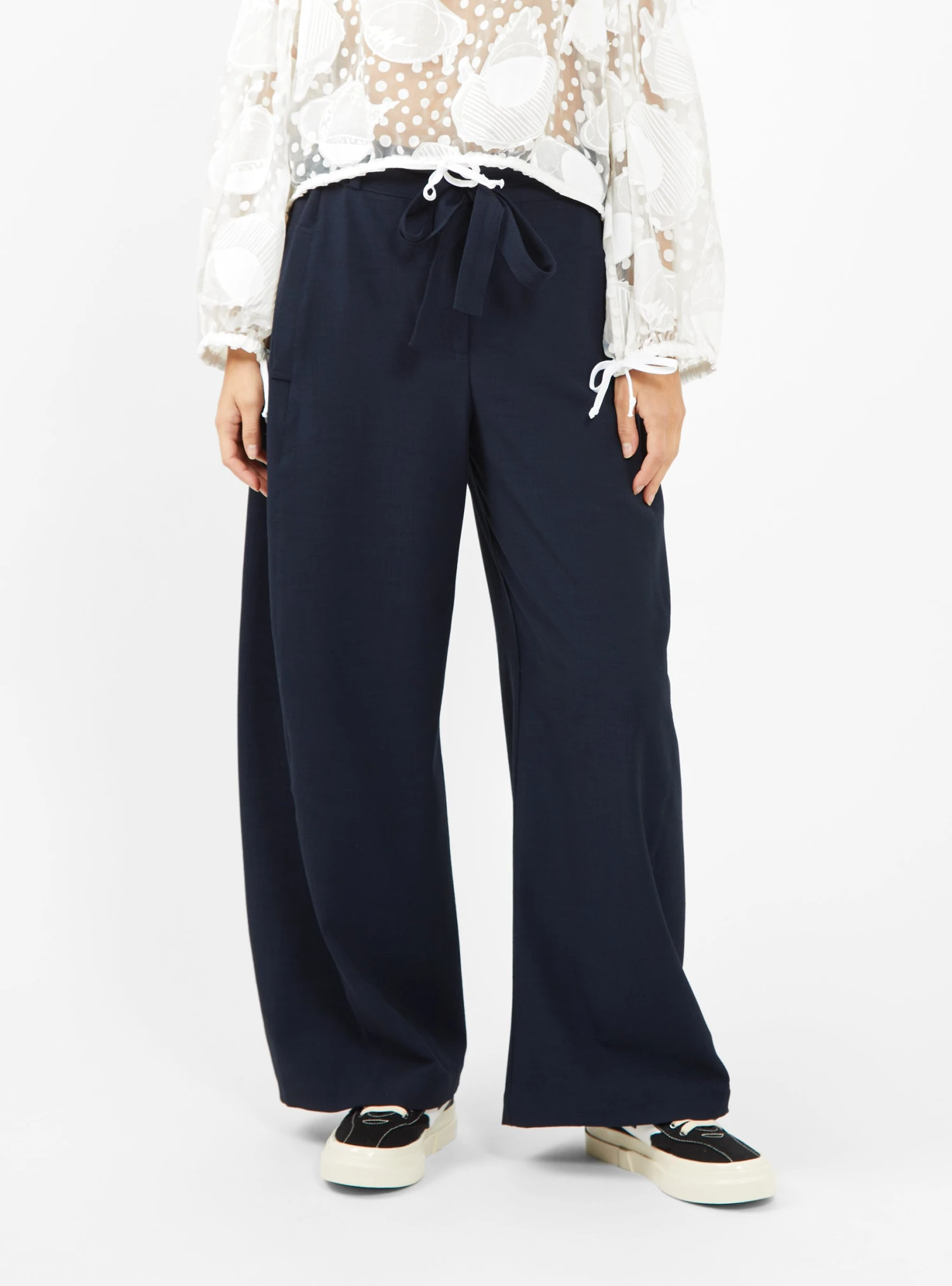 A signature style updated for the season, these navy Again trousers from Henrik Vibskov are cut to a high-rise silhouette with wide legs and ties that can be used to cinch the waist.