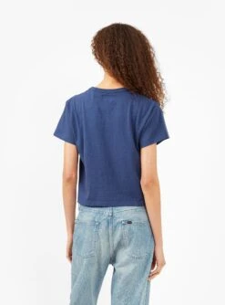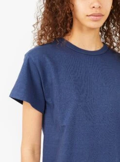 Made in Japan from recycled Ochiwata cotton using one of the last two antique loopwheel knitting machines, which avoids the need for side seams and creates less tension on the fabric, this insignia-blue Hi’aka T-shirt from Sunray Sportwear has a boxy silhouette with a cropped hem.