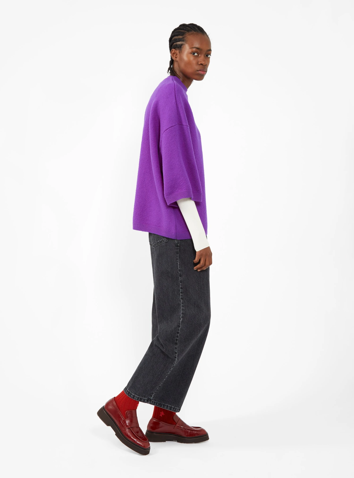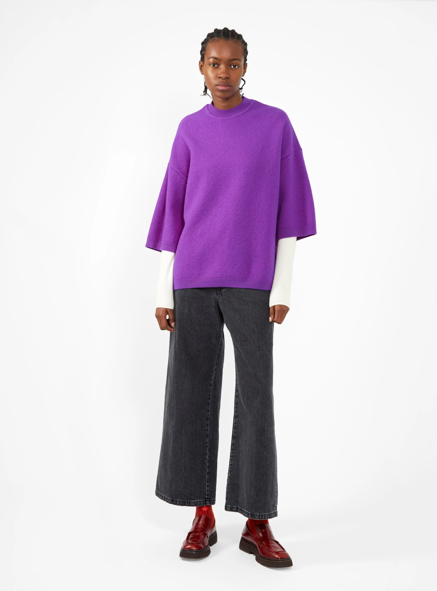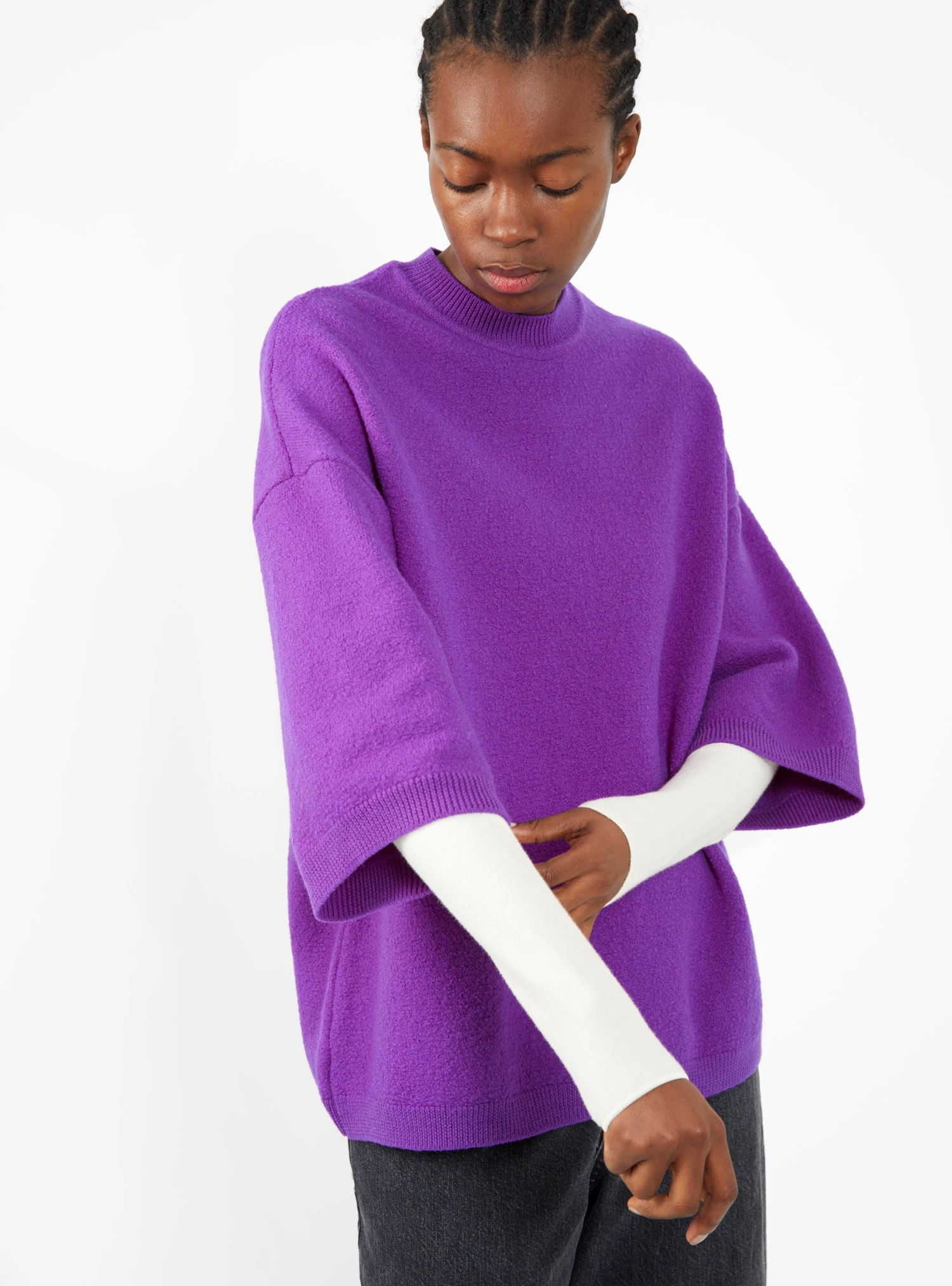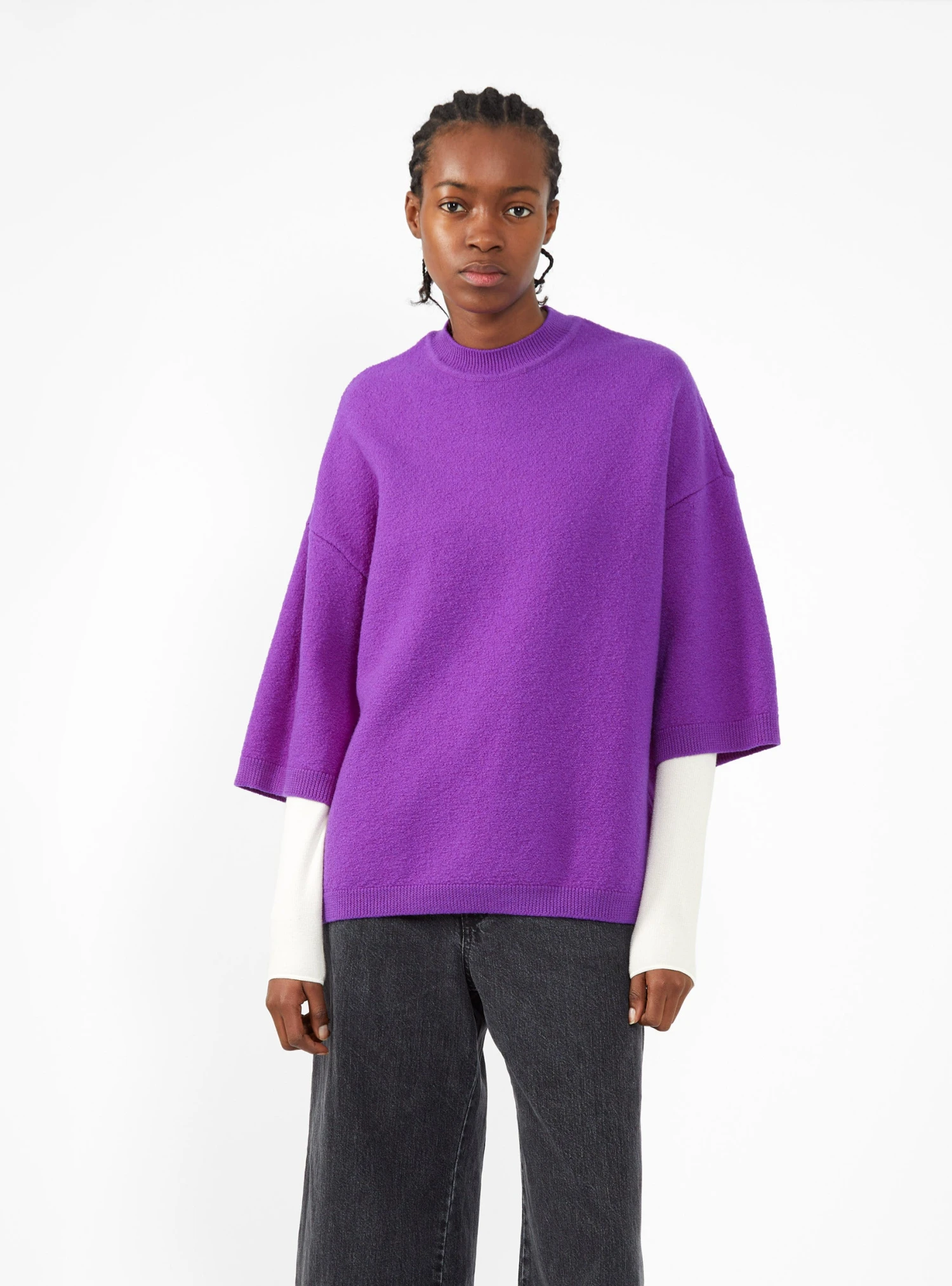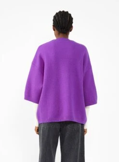 Made from extra fine merino-wool felt, this purple Kolea top from Christian Wijnants is cut to an oversized silhouette with a ribbed crewneck, dropped shoulders, and three quarter-length sleeves.