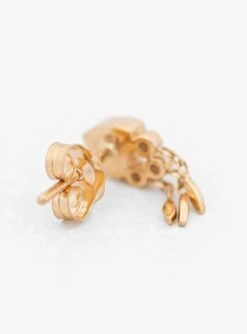 This single earring by Belgian designer Celine Daoust features a central trillian cut light green tourmaline gemstone, complemented with three diamonds and articulated pendants in 14k solid gold. Each gemstone has been individually selected for its unique characteristics that are incorporated by skilled Indian craftsmen into the design of the piece.