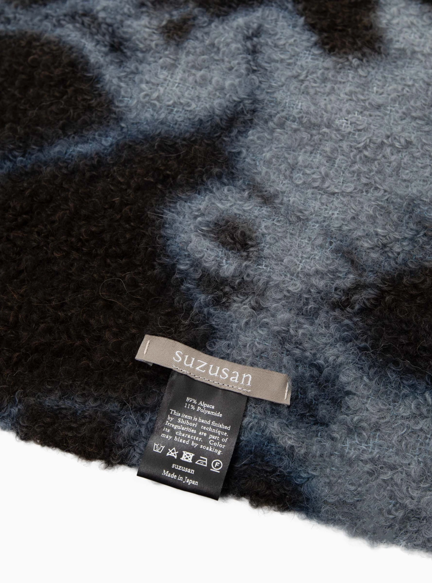 Dyed using the traditional shibori technique, this indigo Madara throw from Suzusan is made in Japan from alpaca-blend bouclé and finished with tasselled ends.