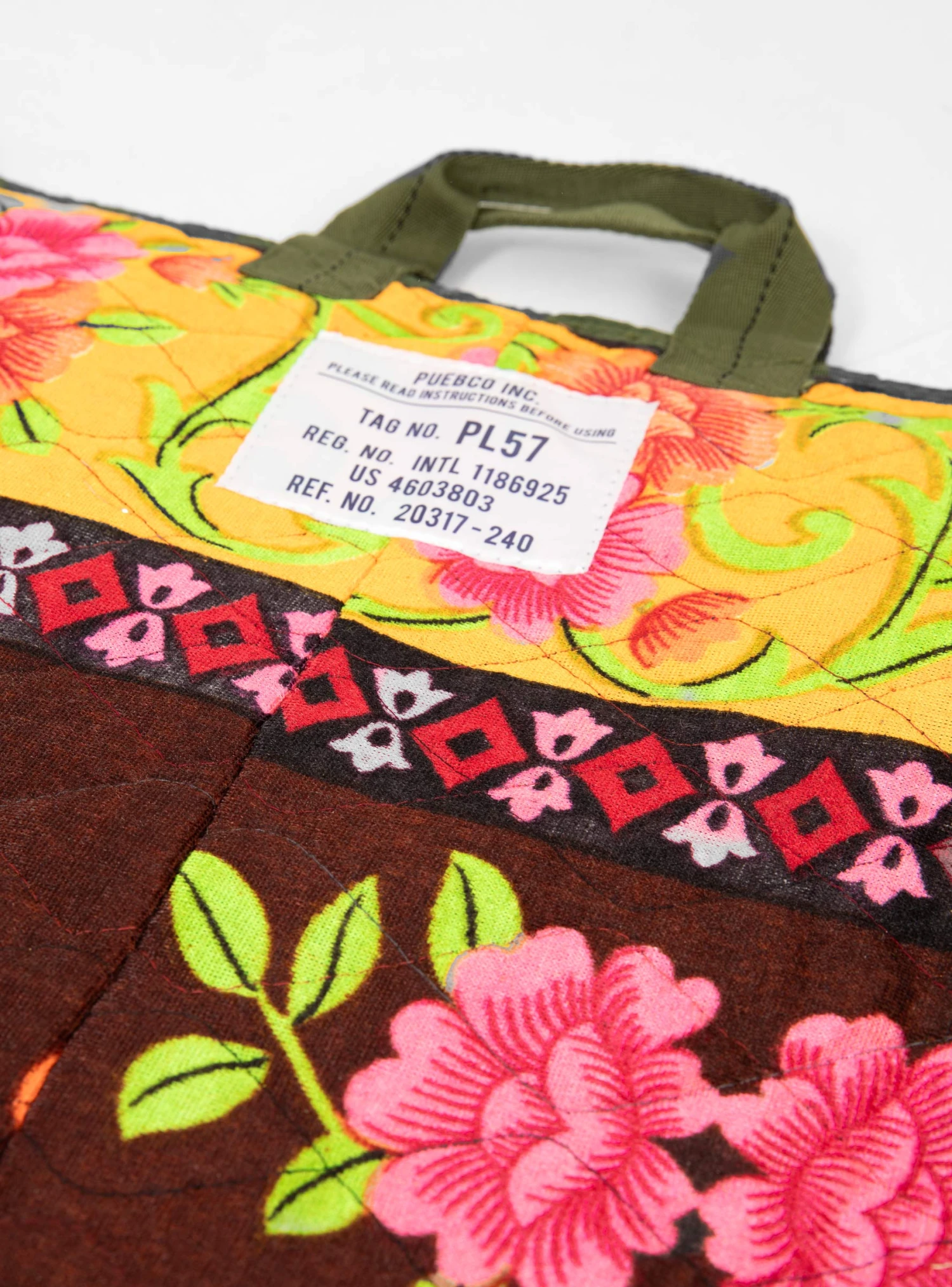 The Mao Helmet Bag by Japanese brand PUEBCO is crafted from recycled fabric that has been quilted and distributed in India for bedding. Coming in a soft brown with flora detailing, the spacious tote has a zip fastening, short handles and a velcro front pocket.