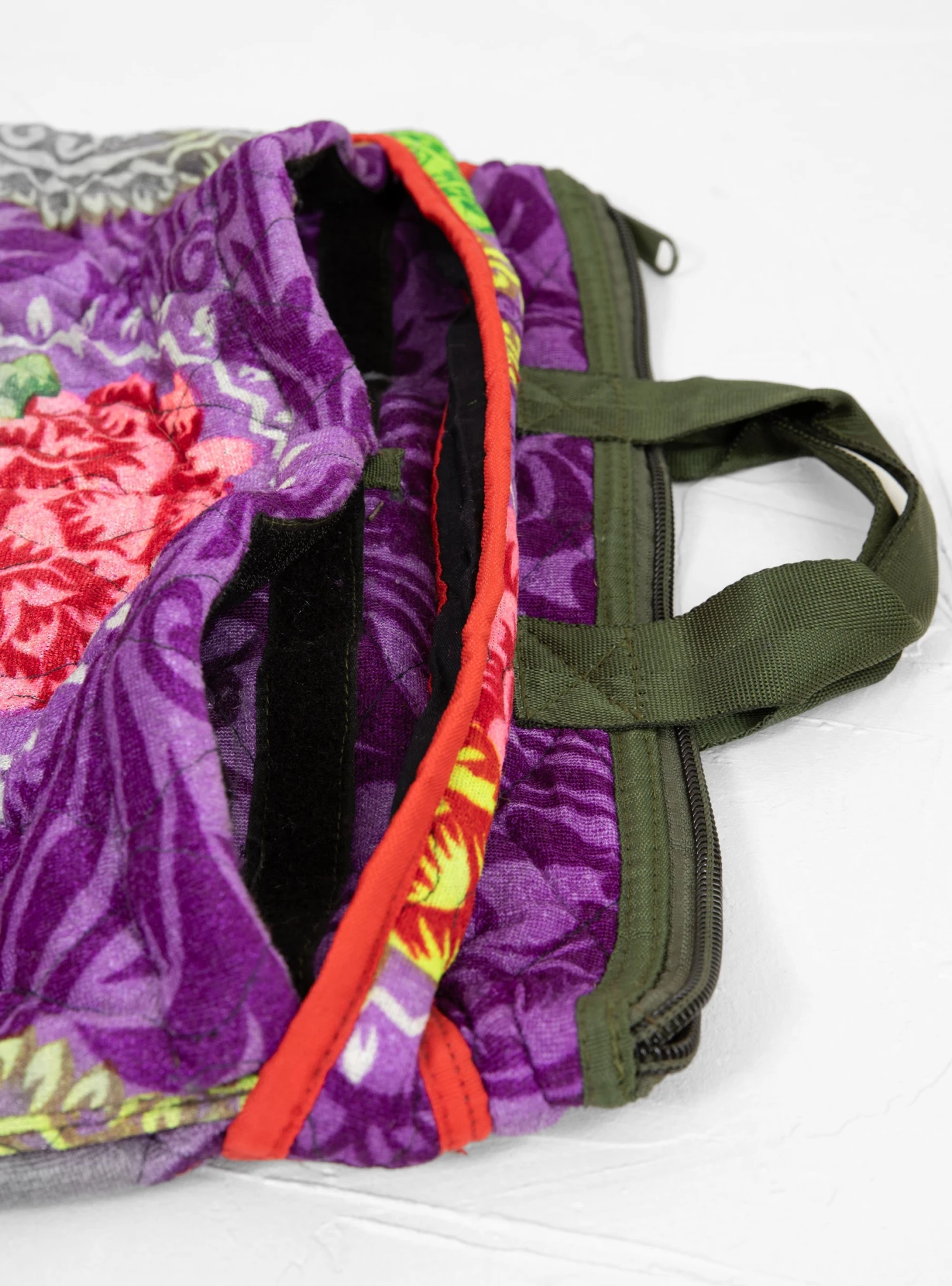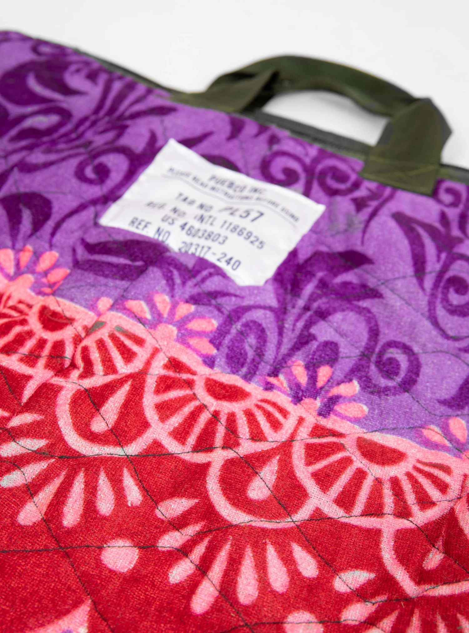 The Mao Helmet Bag by Japanese brand PUEBCO is crafted from recycled fabric that has been quilted and distributed in India for bedding. Coming in a vibrant purple, the spacious tote has a zip fastening, short handles and a velcro front pocket.