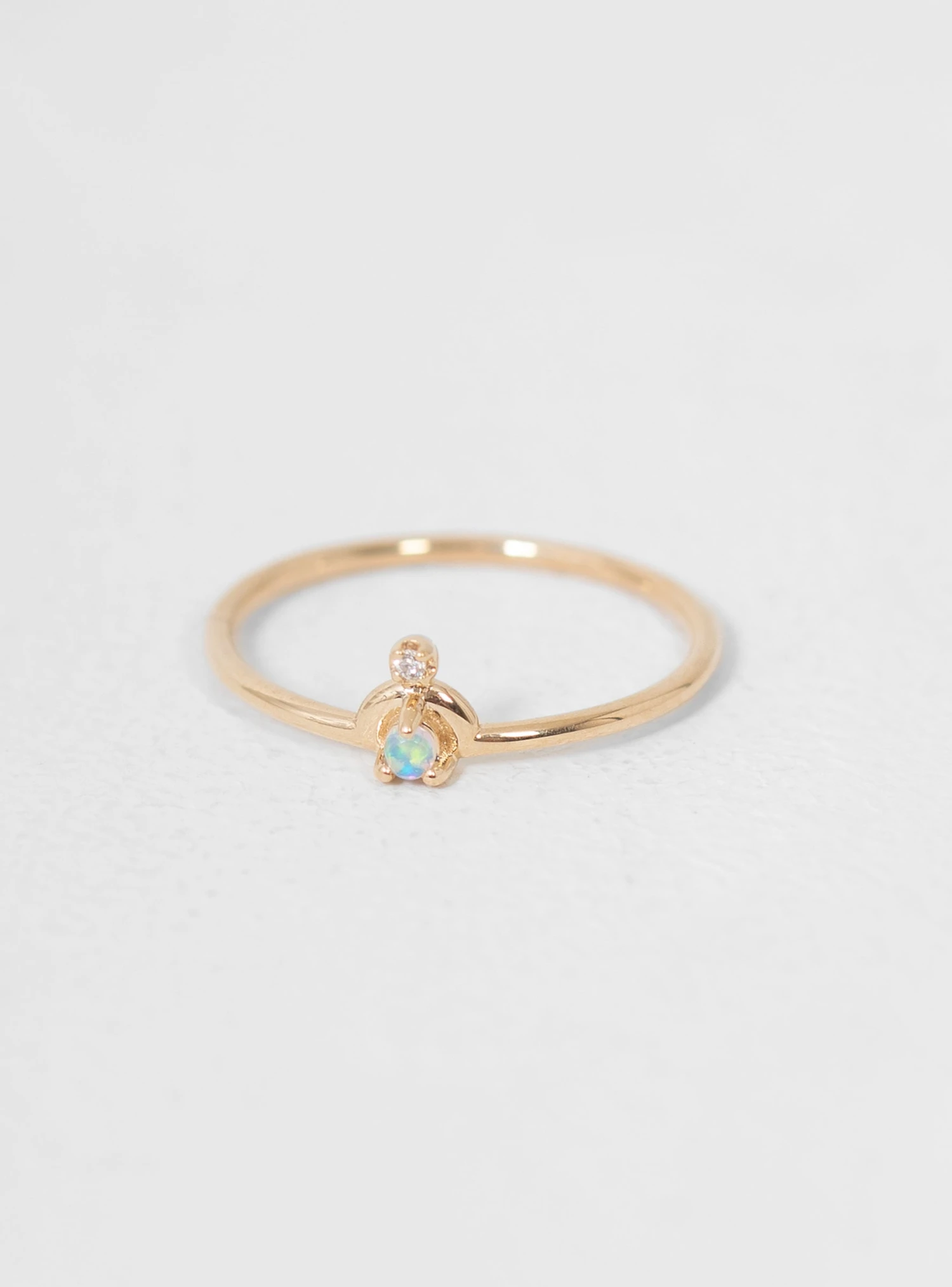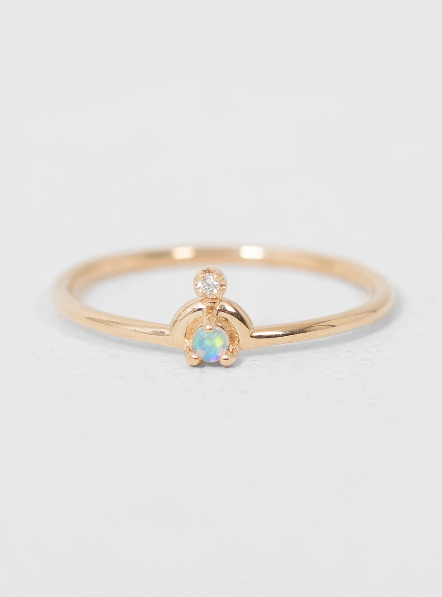 The Mini Nestled Ring by Wwake features a brilliant natural opal beneath a golden arc, complemented perfectly by a subtle diamond. Wear it alone or stacked with other pieces.