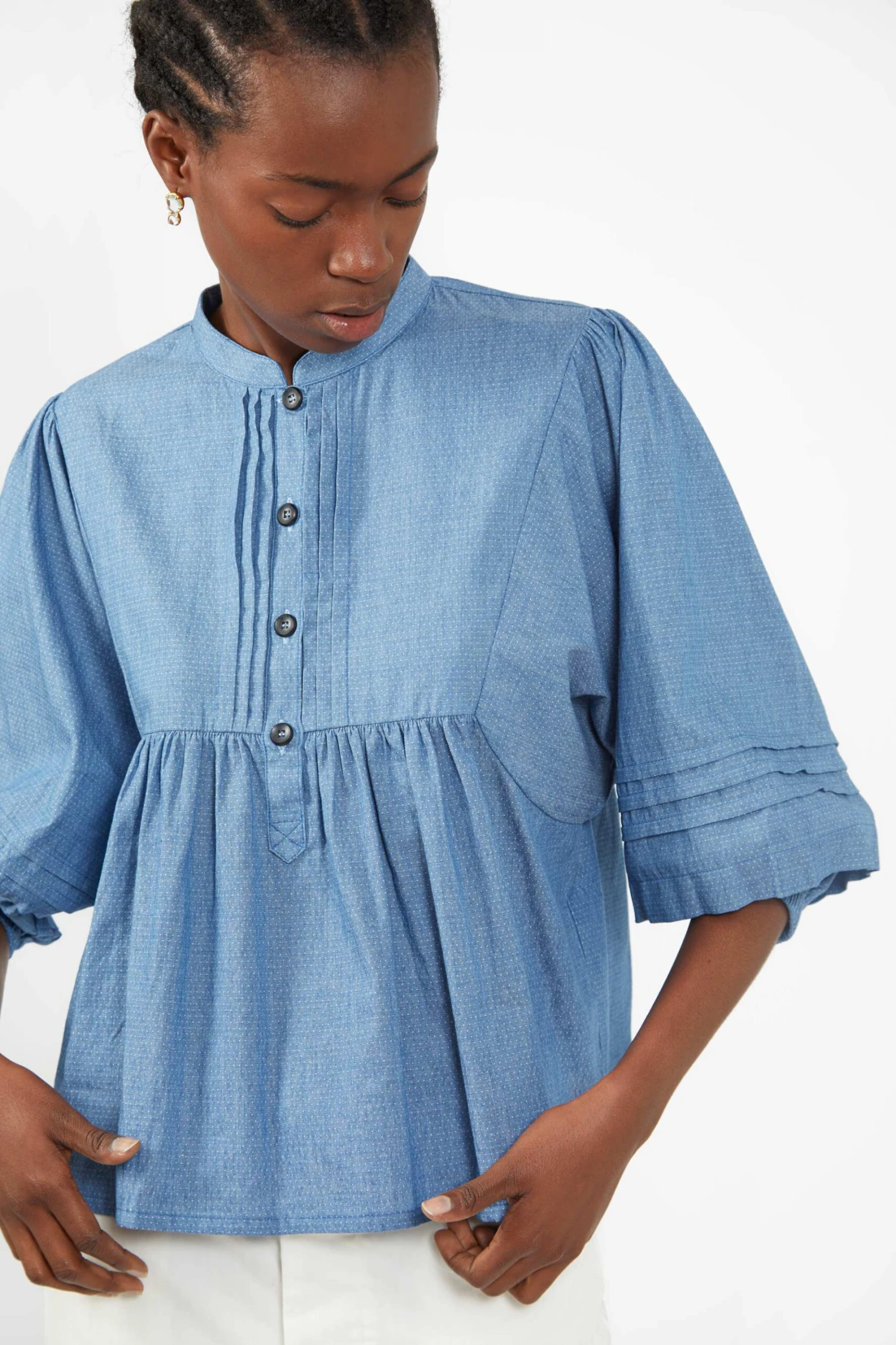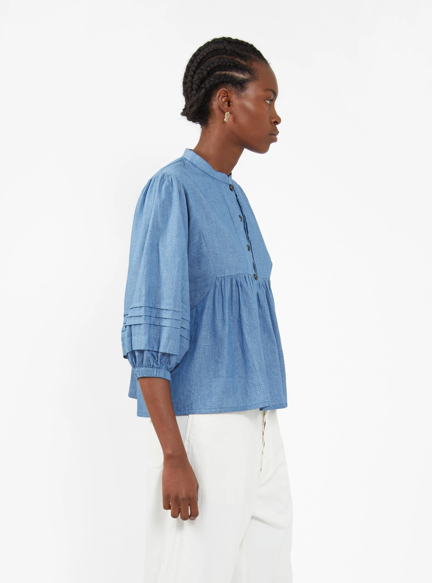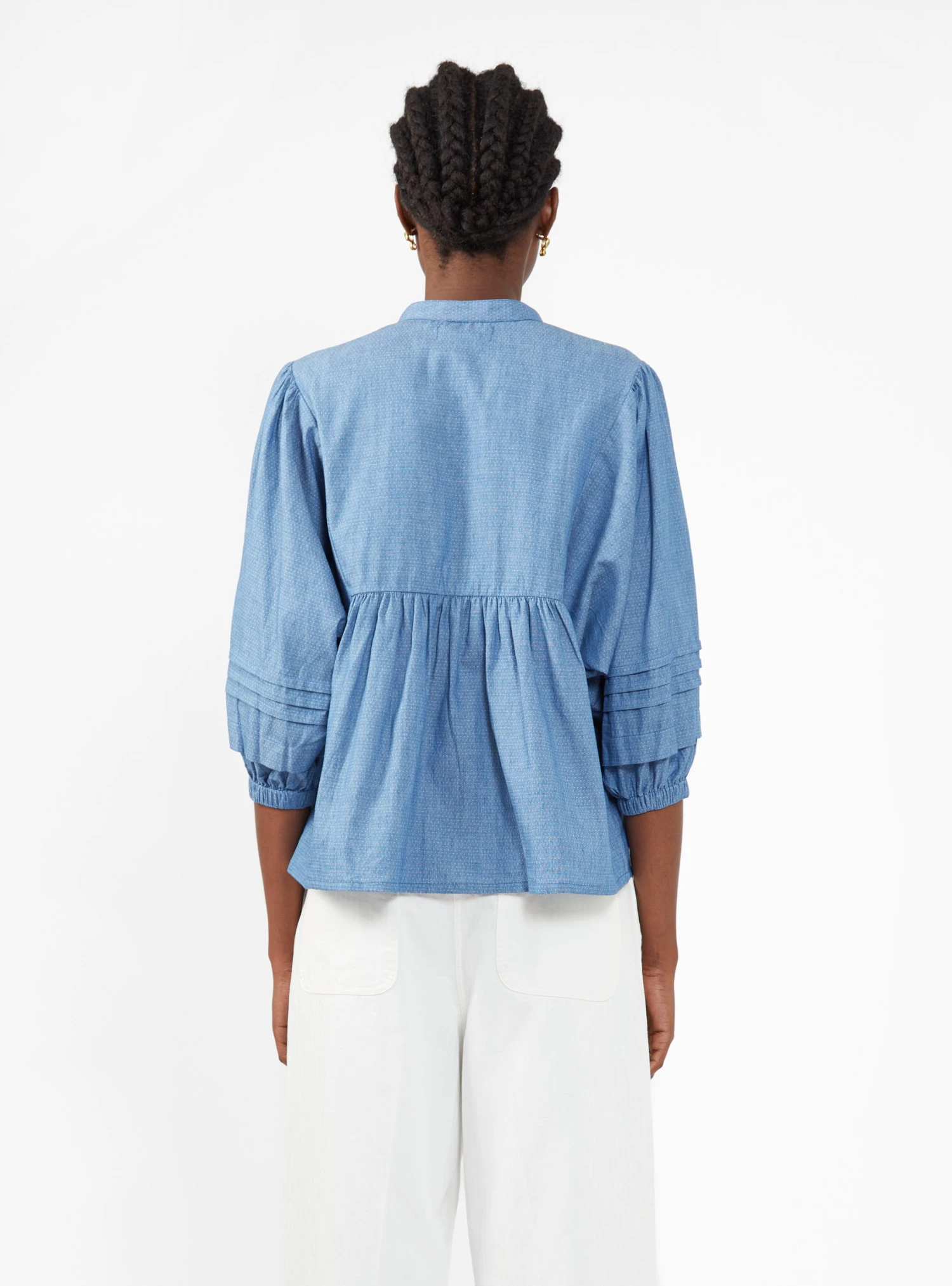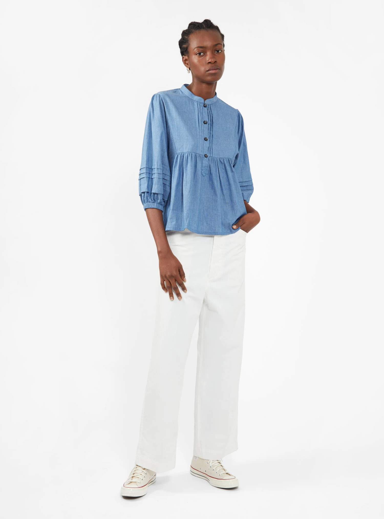 Look to Sideline for effortless pieces such as this blue Moon top. Made from soft cotton chambray with a micro-dot pattern weave, it’s cut to a boxy silhouette with pleated trims and elasticated cuffs.