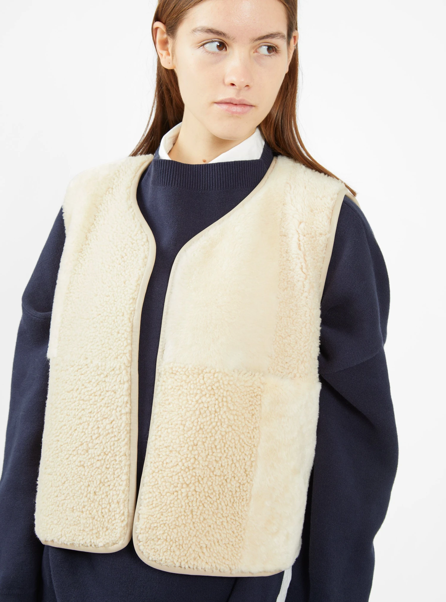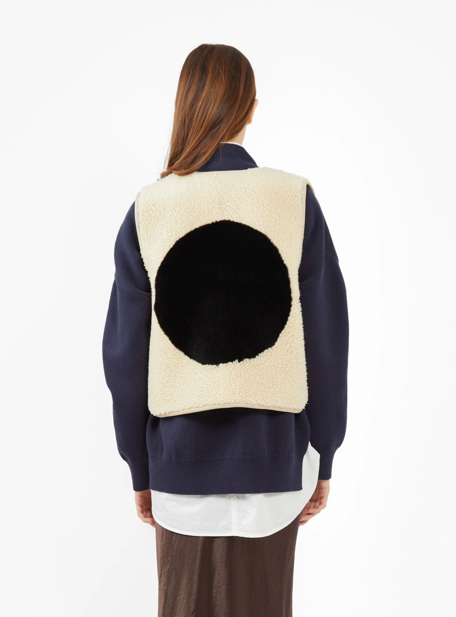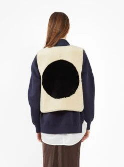 The cream Moon Vest by Milena Silvano is a reversible piece crafted from sheepskin and cut to a relaxed silhouette with side pockets, and features an abstract moon patch design at the back.