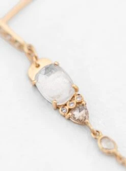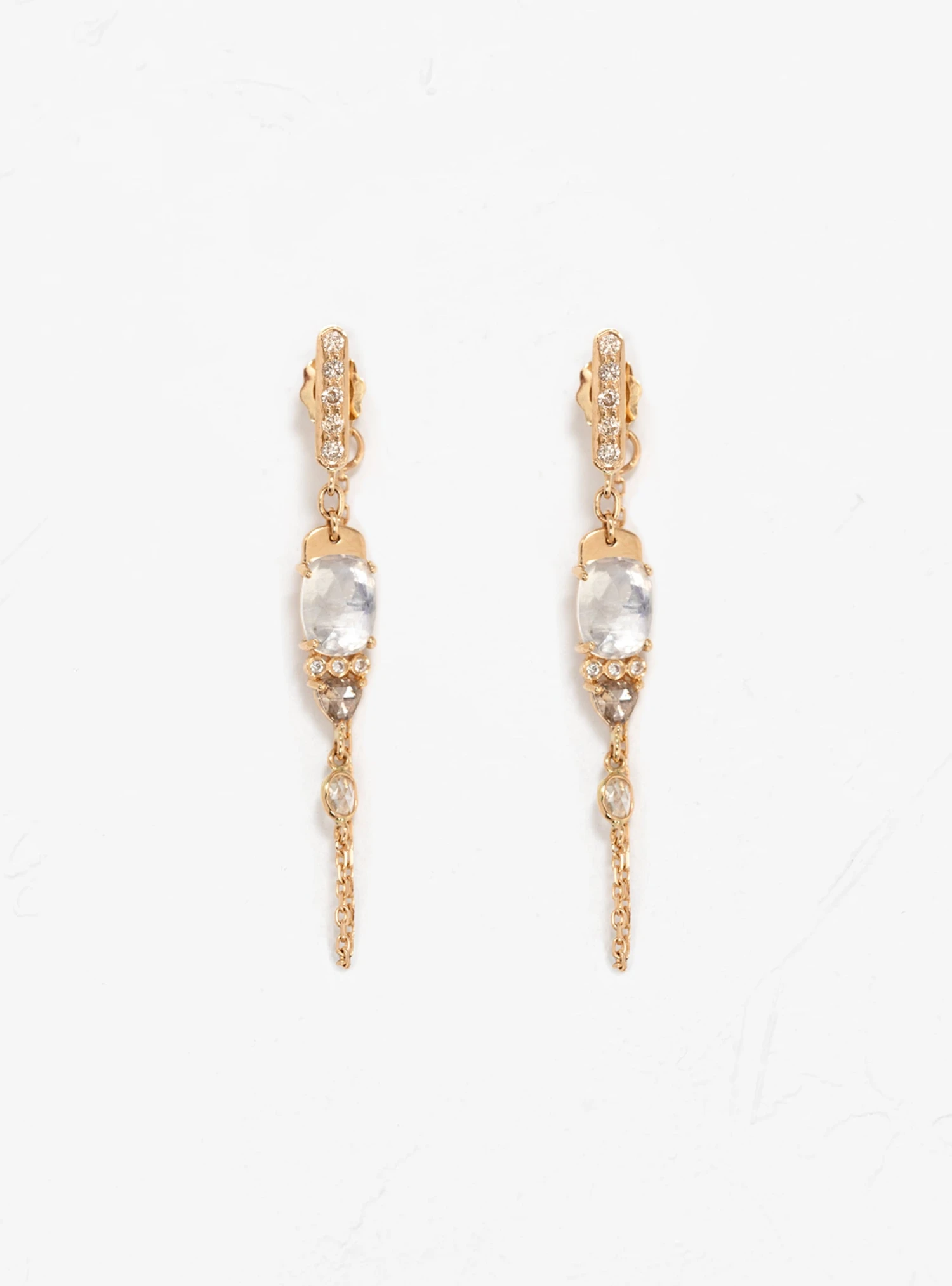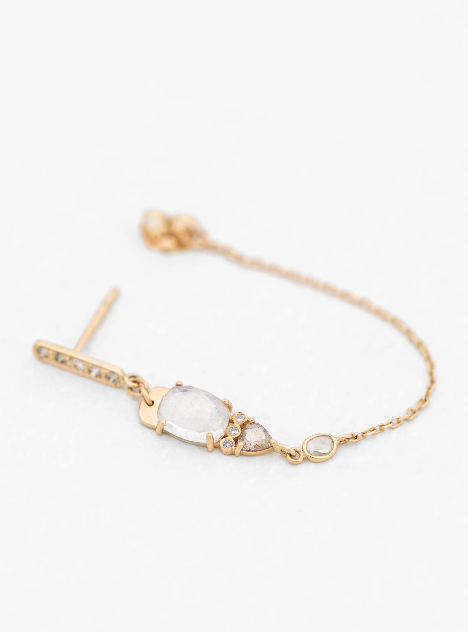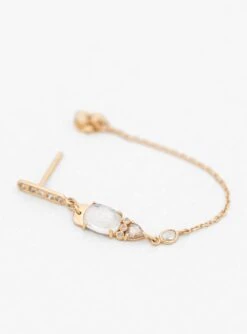 Inspired by her experiences travelling between India, France and Belgium, jewellery designer Celine Daoust’s pieces are a fusion of ancestral craftsmanship and cultural references. These Moonstone & Diamond earrings features a large freeform cut moonstone set in 14k yellow gold with additional smaller moonstone and diamonds inset throughout. A fine gold chain connected to the butterfly back completes the design to form a loop around the ear.