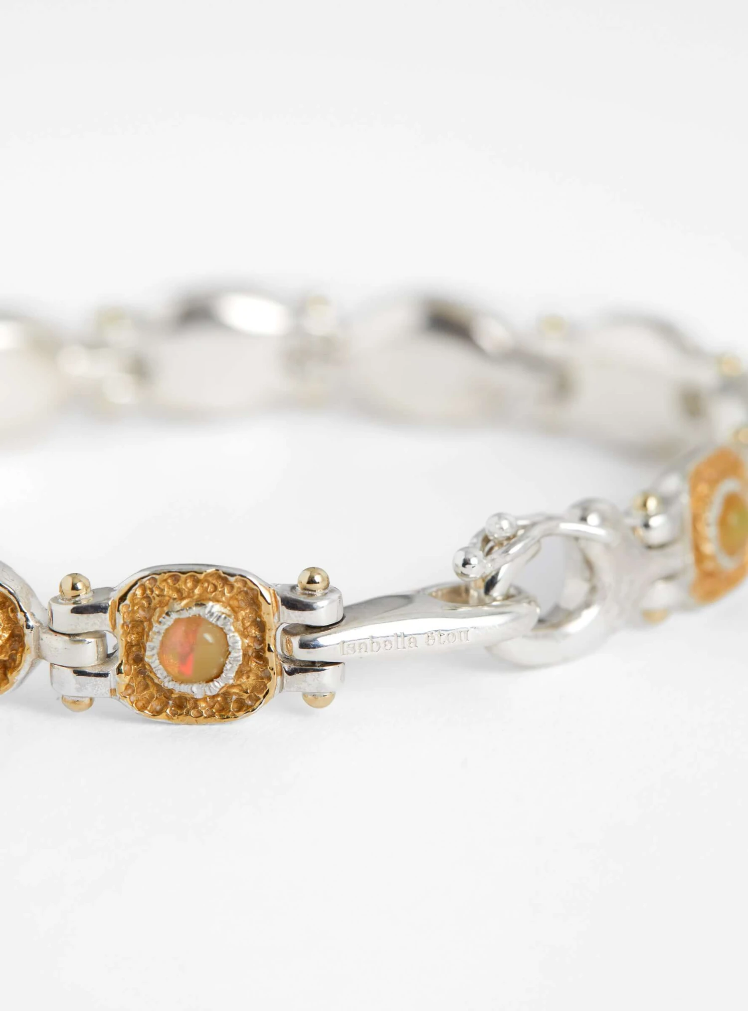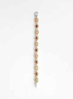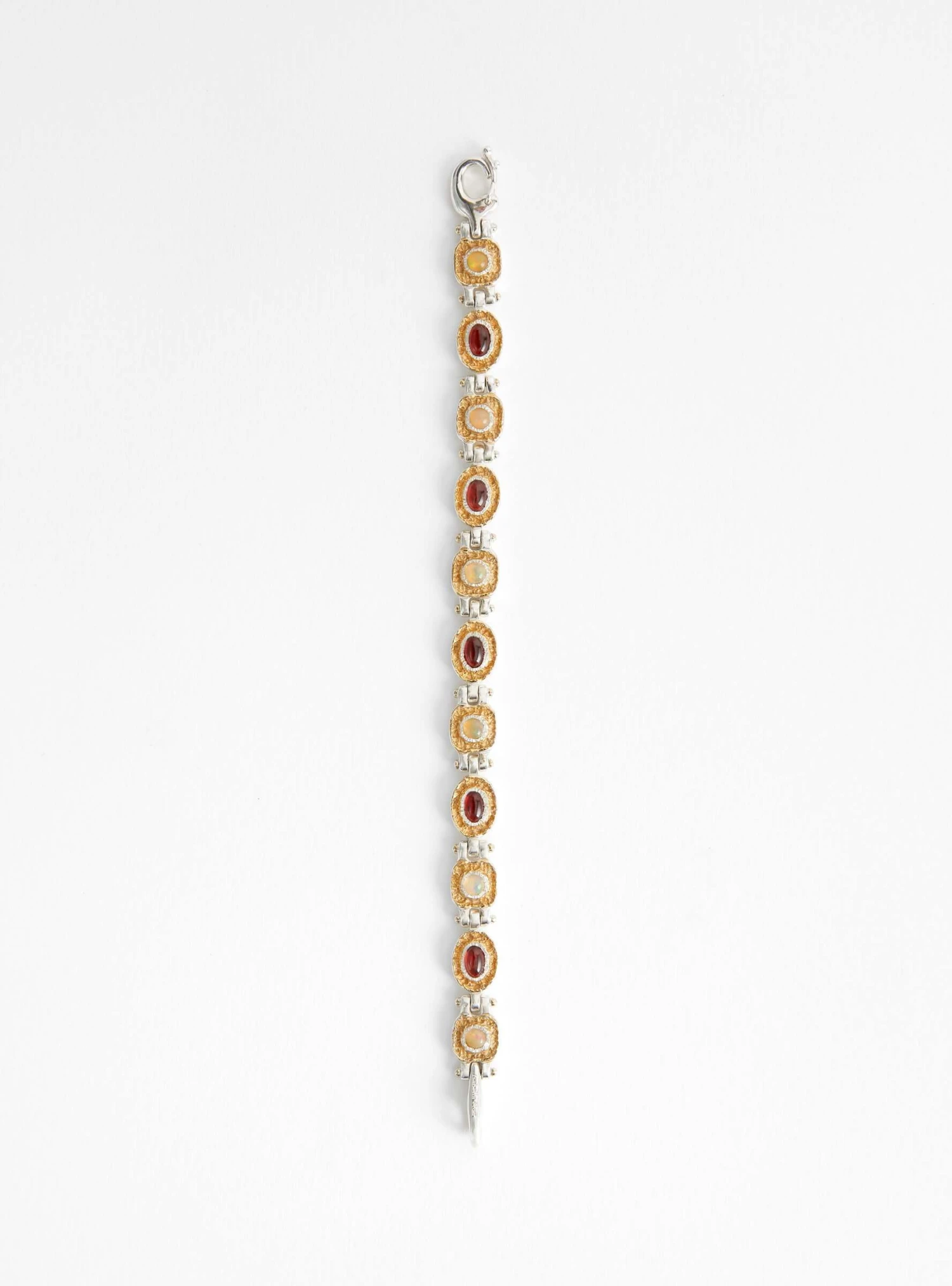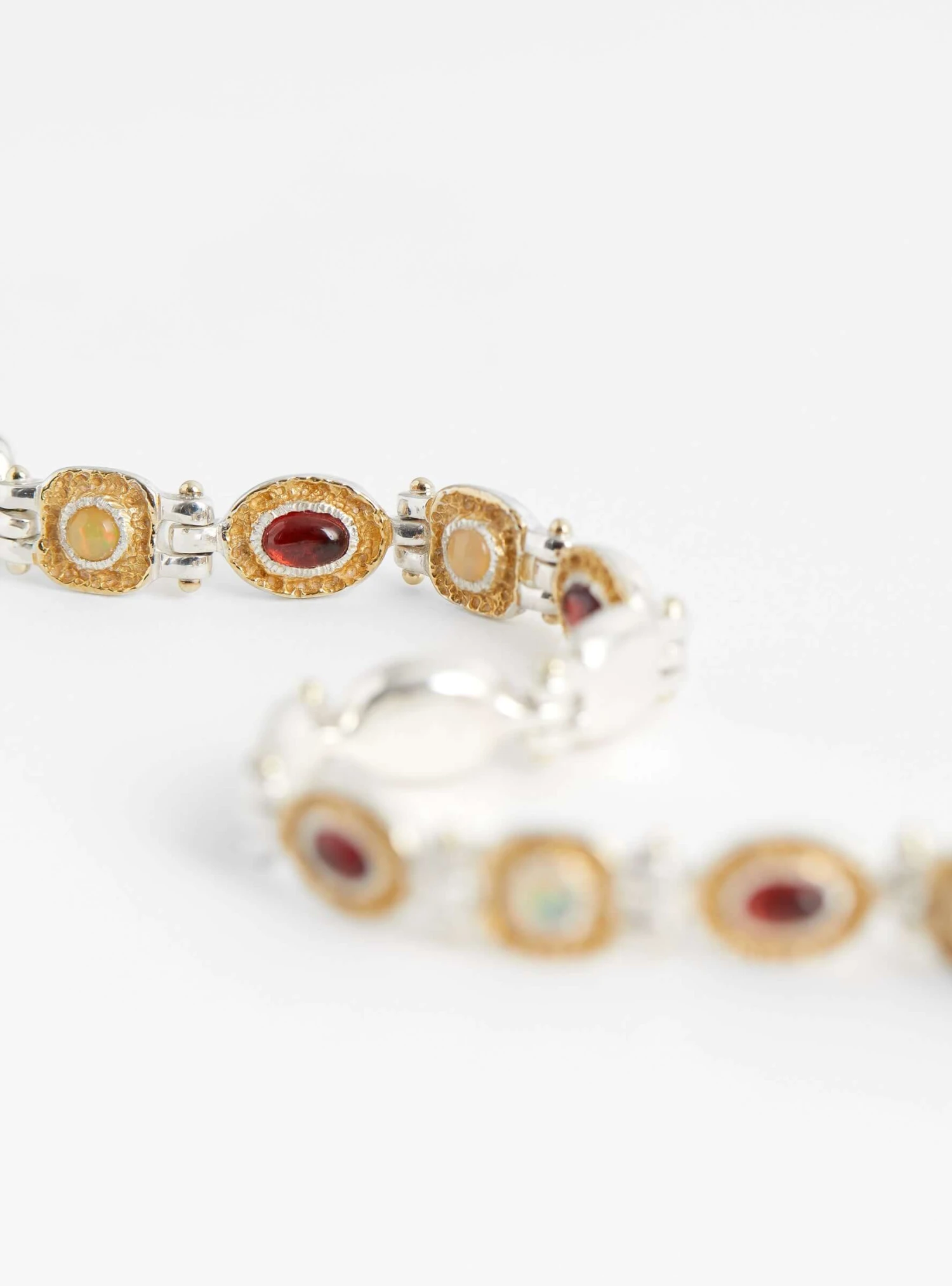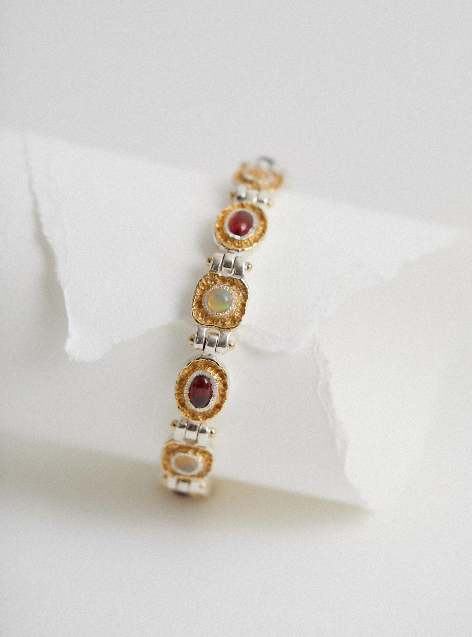 The Mothers Bracelet from Korean-jeweller Isabella Etou is crafted from a 925 Sterling Silver with stones of Opal and Garnet. The geometric link bracelet draws inspiration from nature in its rough edges that house the stones and is closed with a durable bulldog clasp.