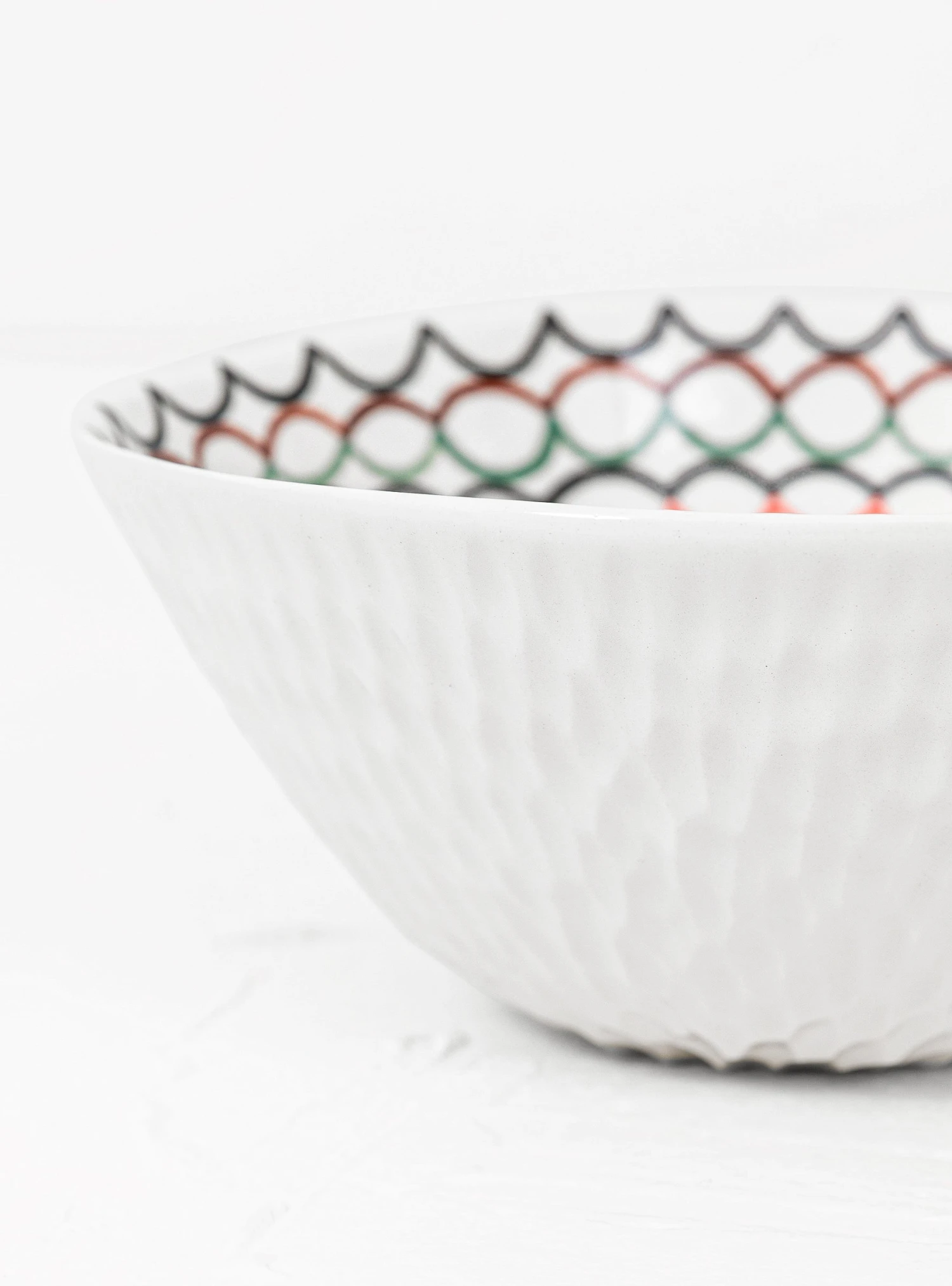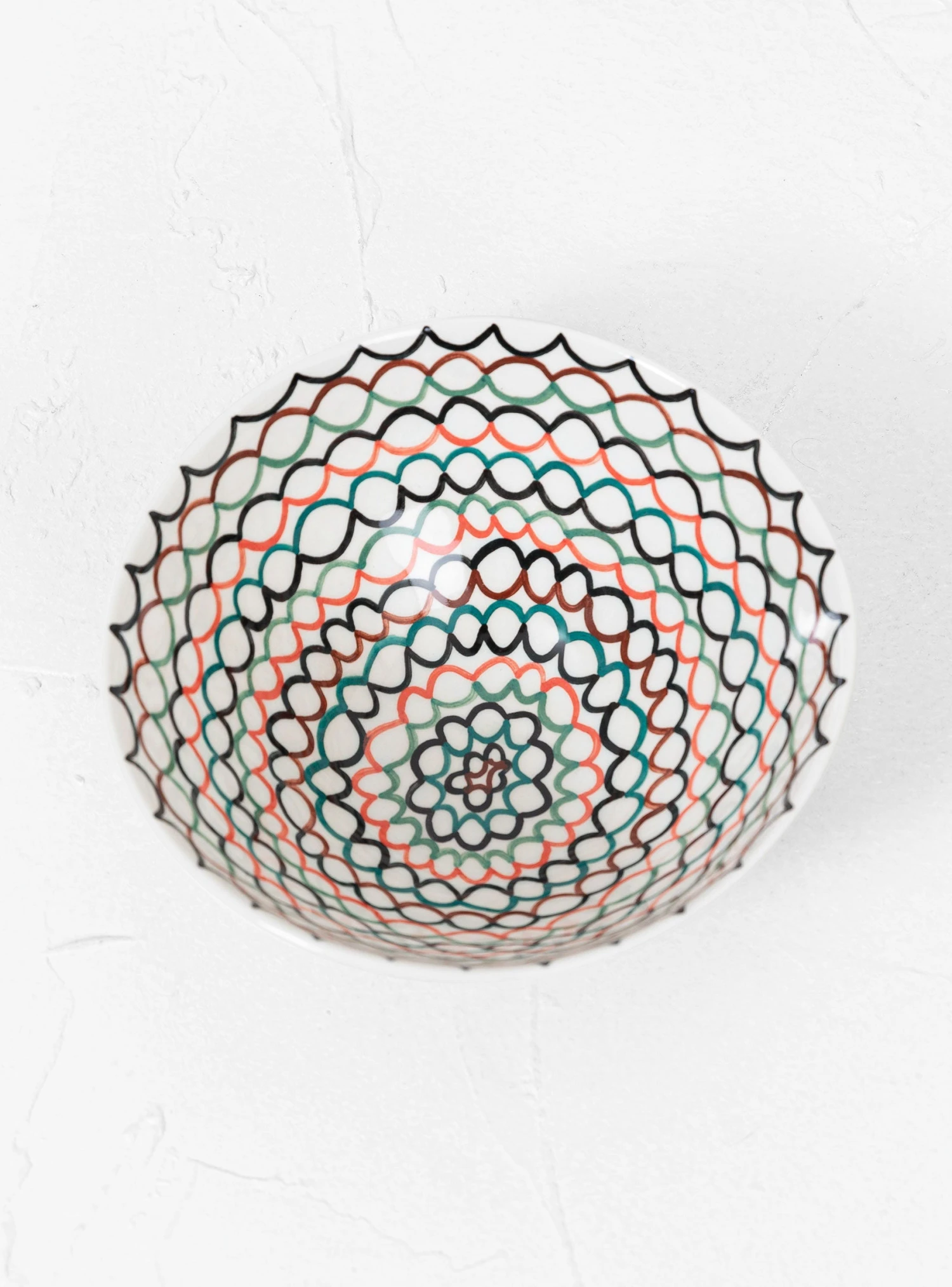 Crafted in the artisan’s rural Lithuanian studio, Aida Dirse’s Multicolour Pattern Bowl n59 is formed from white clay, hand-painted with under-glaze pigments and finished with a softly dimpled outer and a clear glaze. This bowl is painted with a multi-coloured, circular pattern.