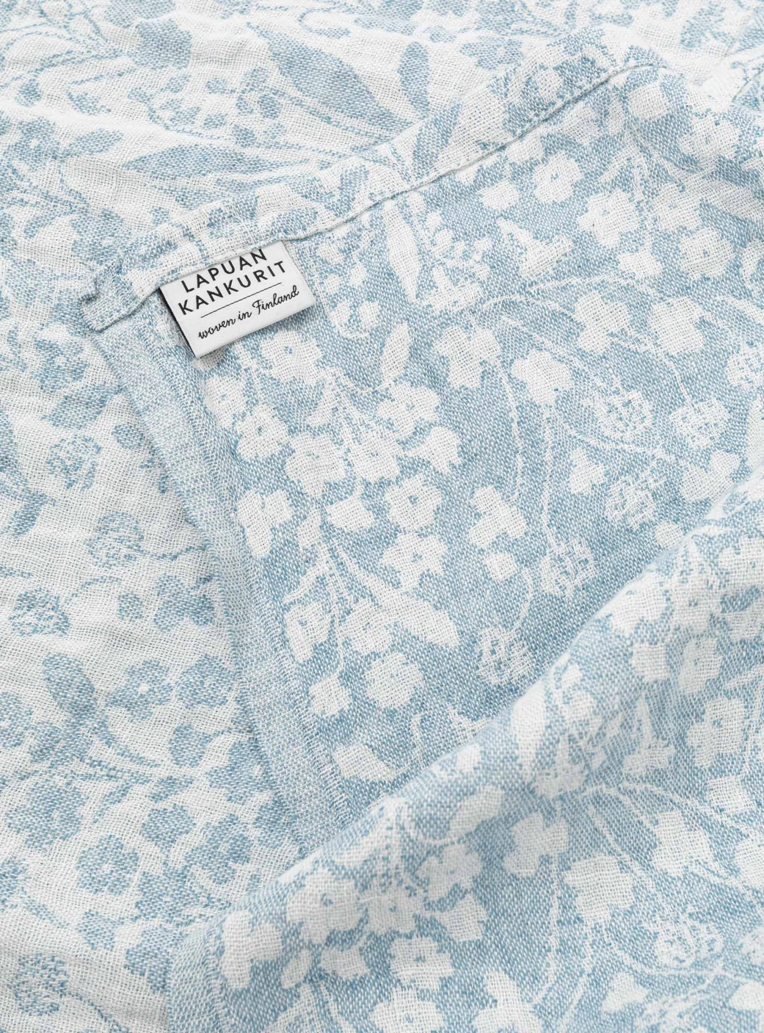 Washed to create a soft texture, this rainy-blue Niitty throw from Lapuan Kankurit is made in Finland from linen with a floral jacquard motif.
