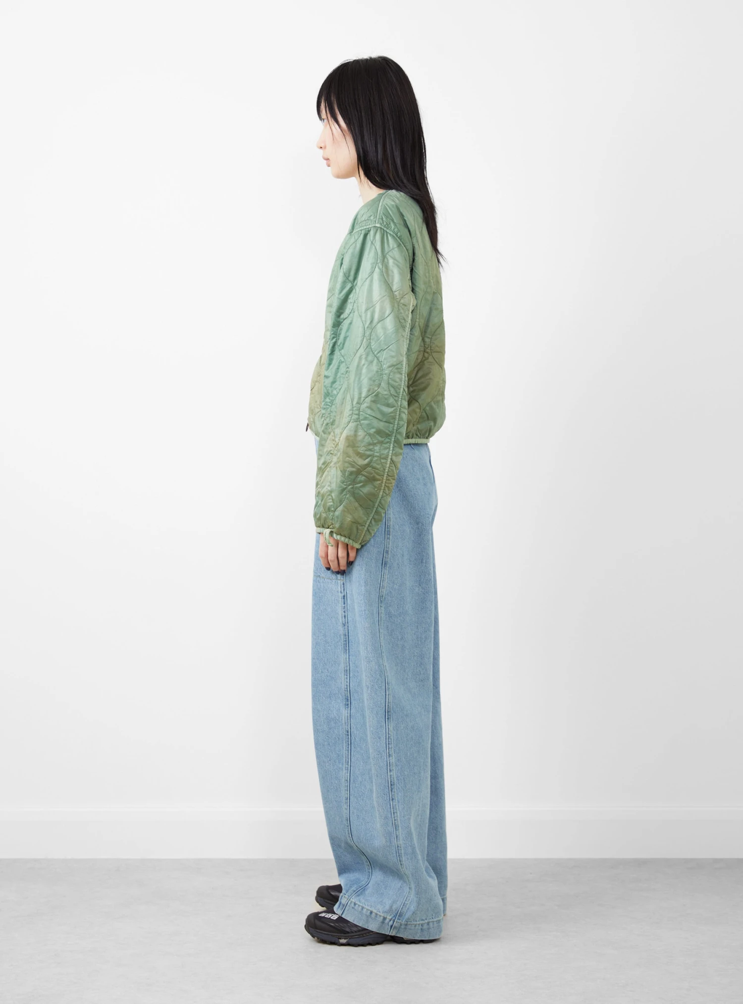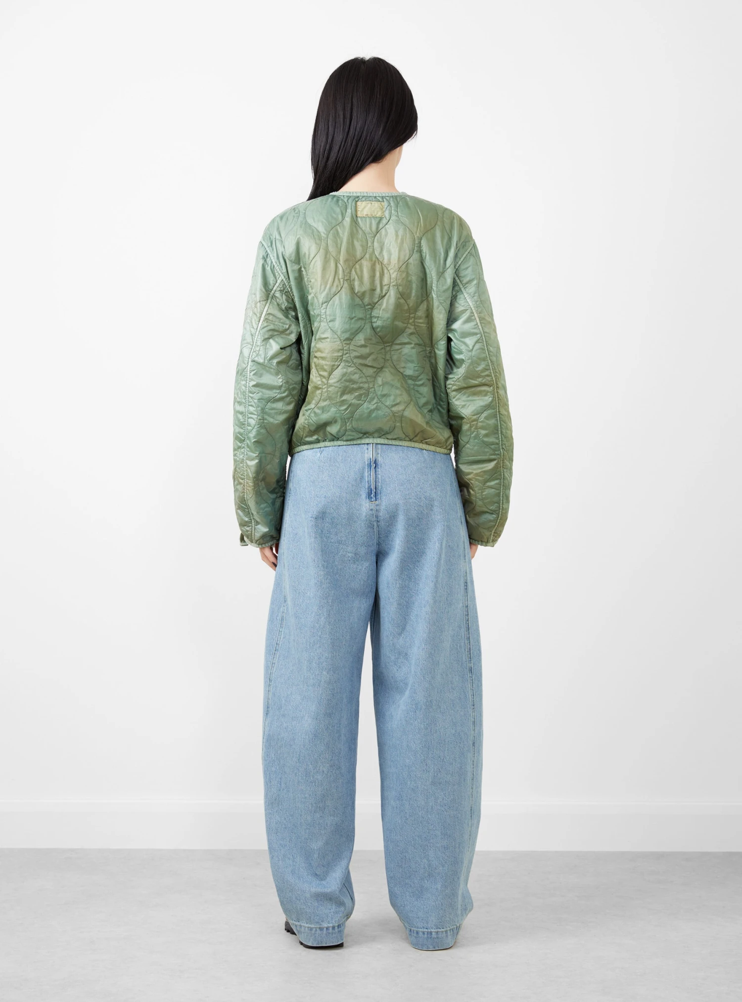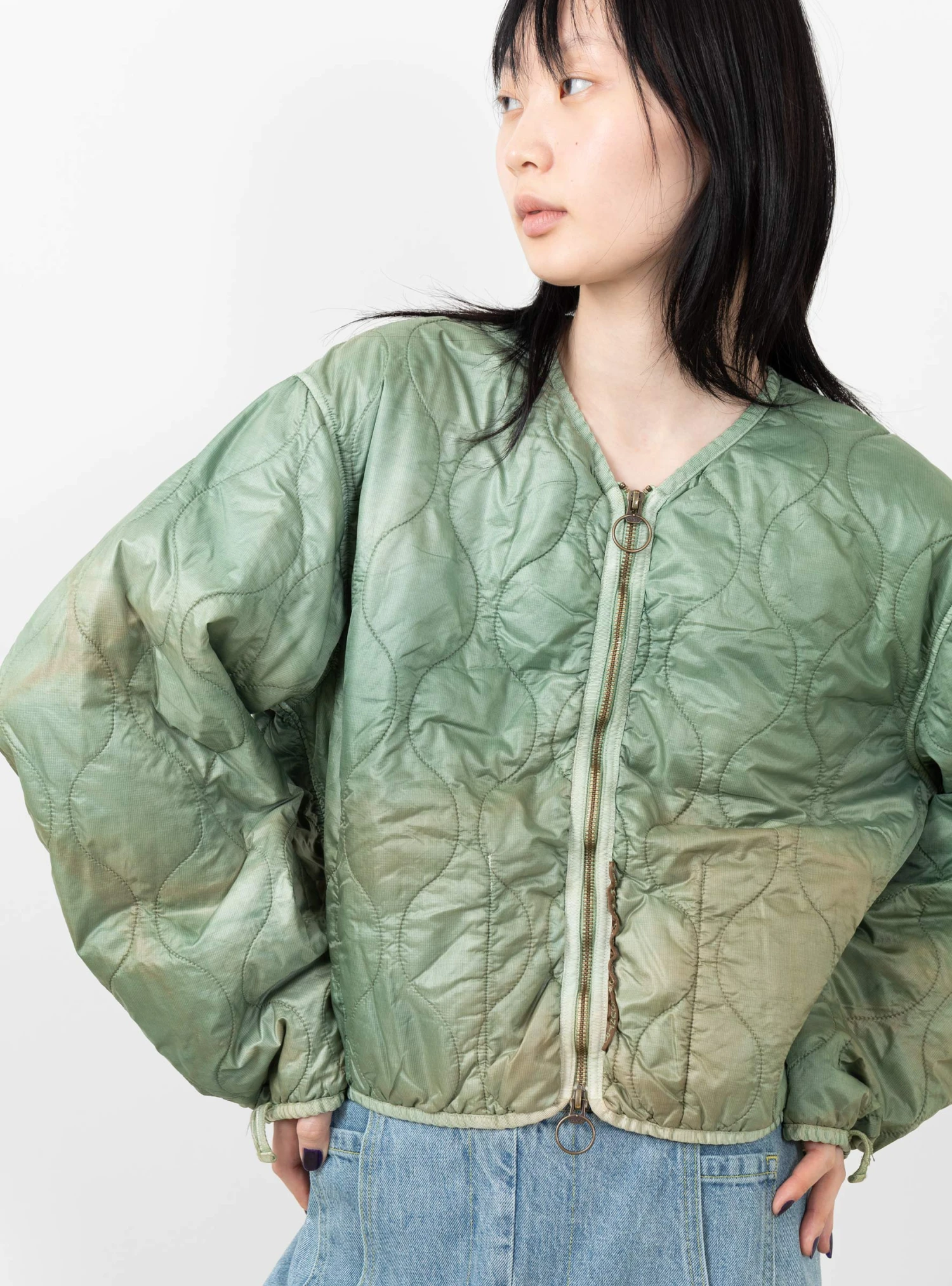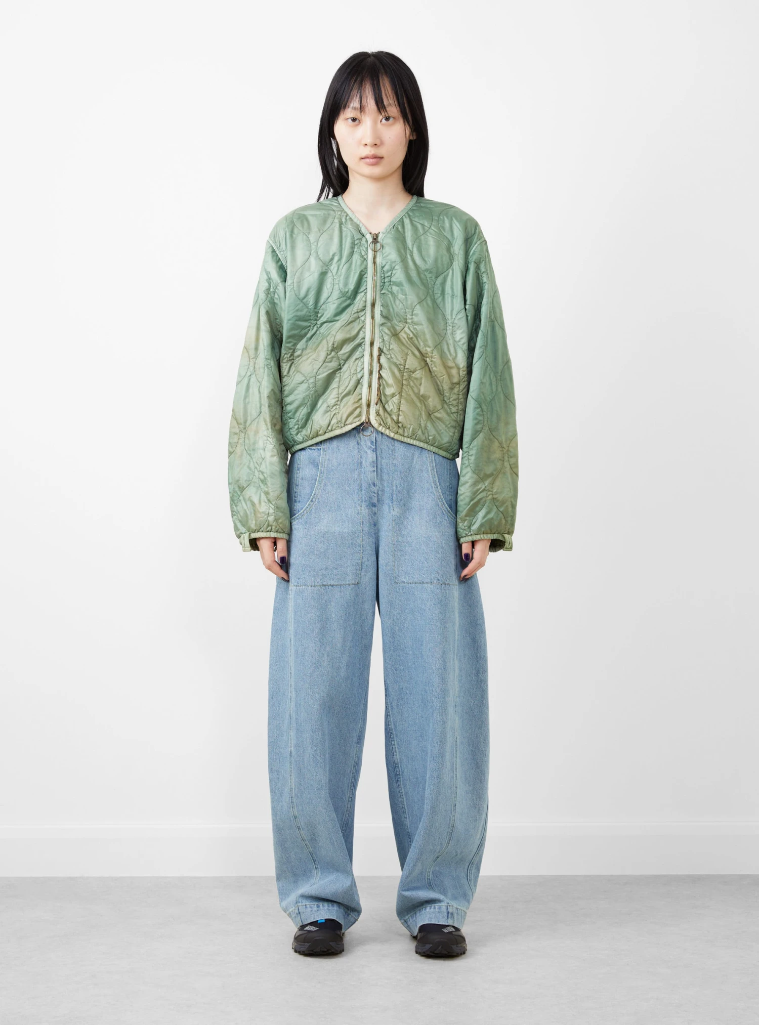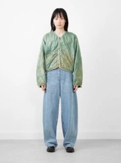 The Nylon Quilting Cropped Bolero jacket from Kapital comes in a light green. Made in Japan, the jacket falls to a regular fit with voluminous, drop shoulder sleeves and a cropped finish. The jacket features a round neckline and a two-way zip fastening, with a trim detail at the neck, zip and trims and is finished with a dye-effect throughout, giving the jacket an uneven colour.