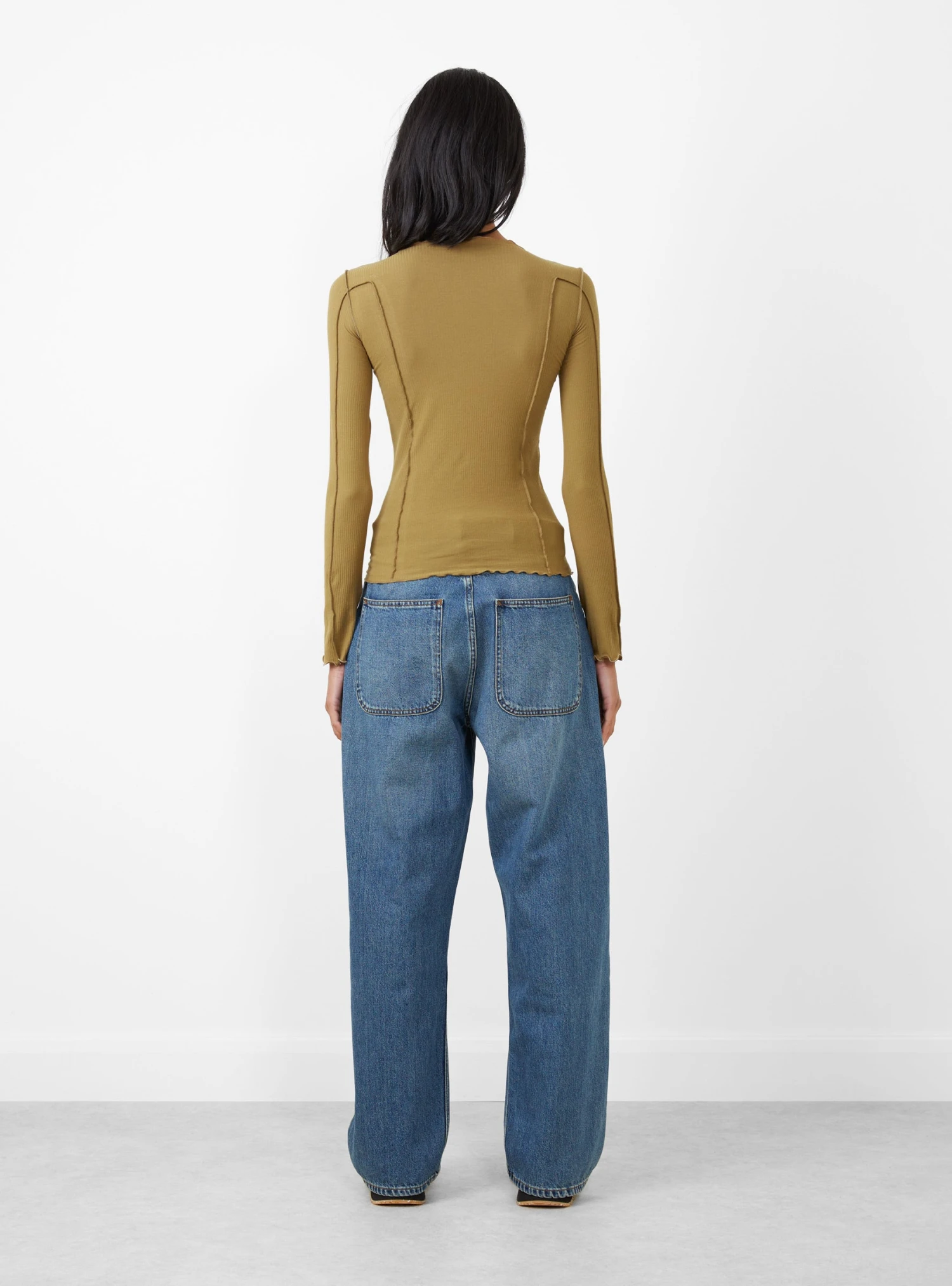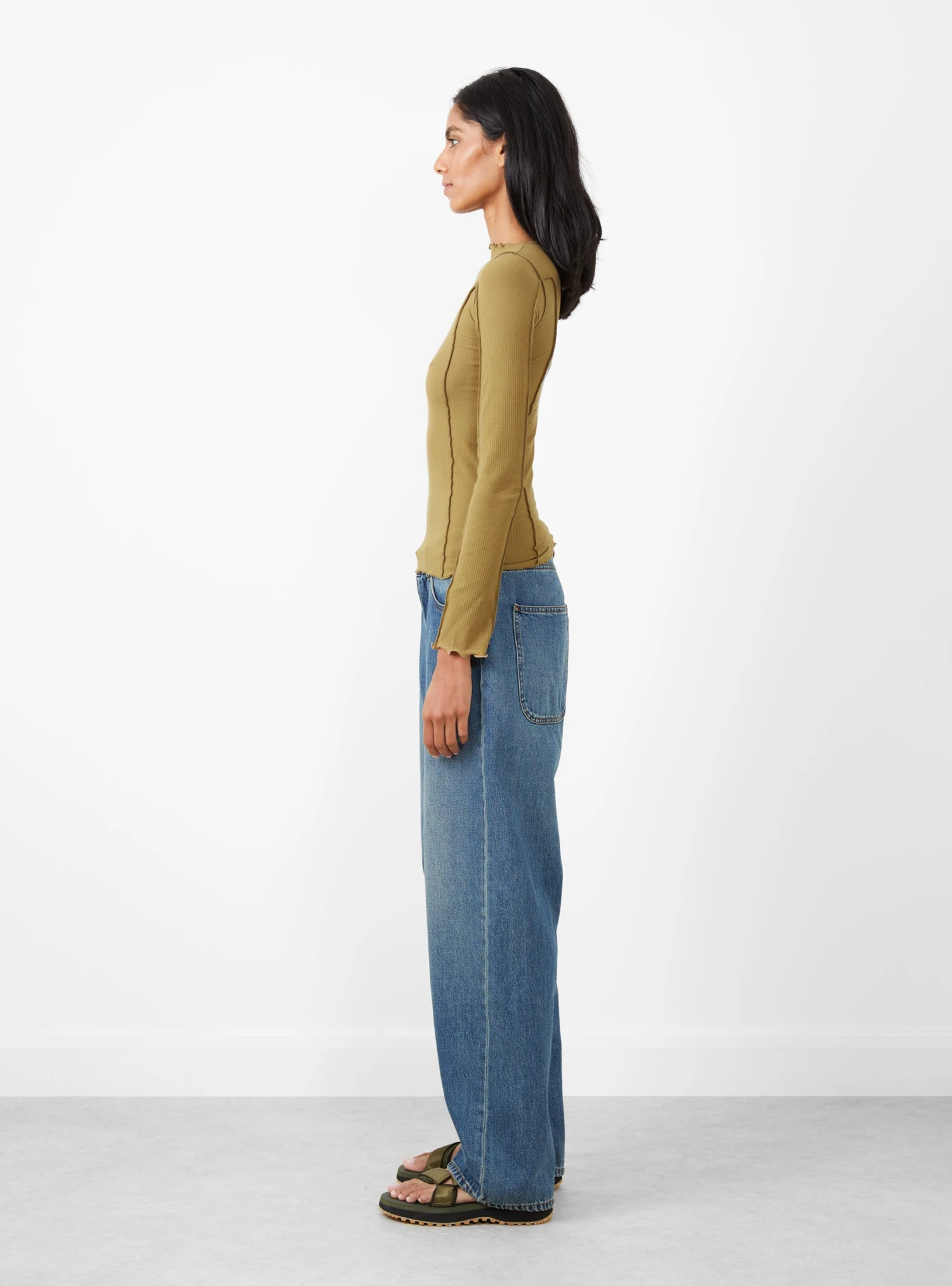 The Omato Long Sleeve from Baserange arrives in a Jade Brown. Made in Portugal from an organic cotton blend, the boatneck tee takes a form-fitting silhouette. Exposed seams and lettuce edge trims finish the top.
