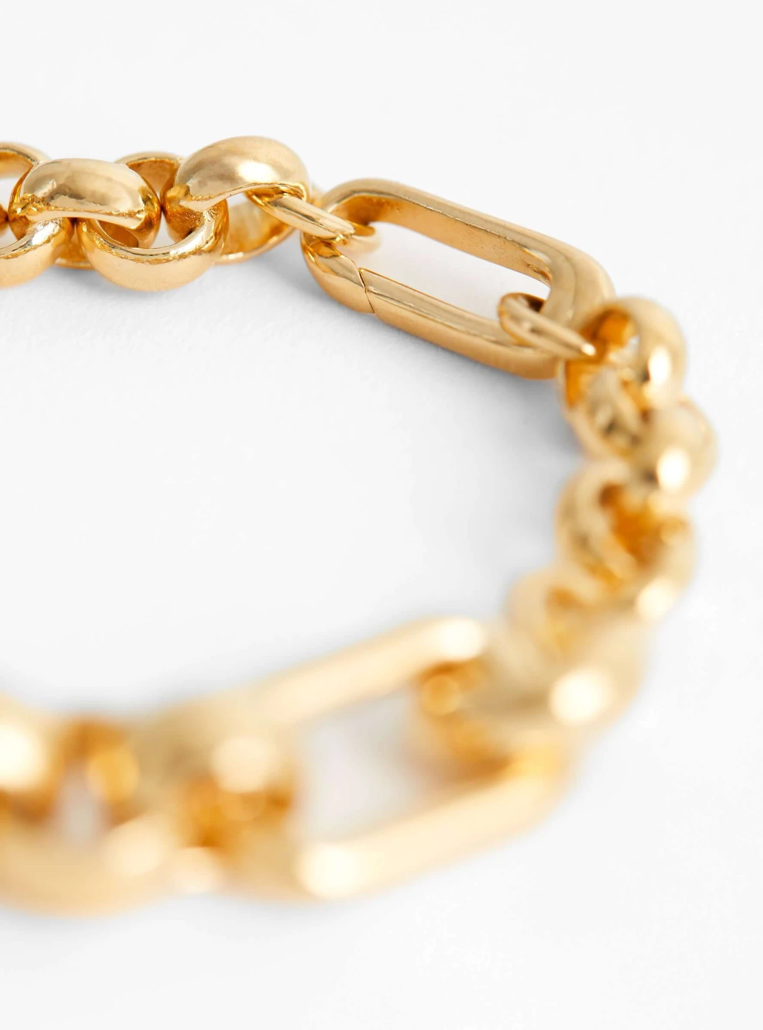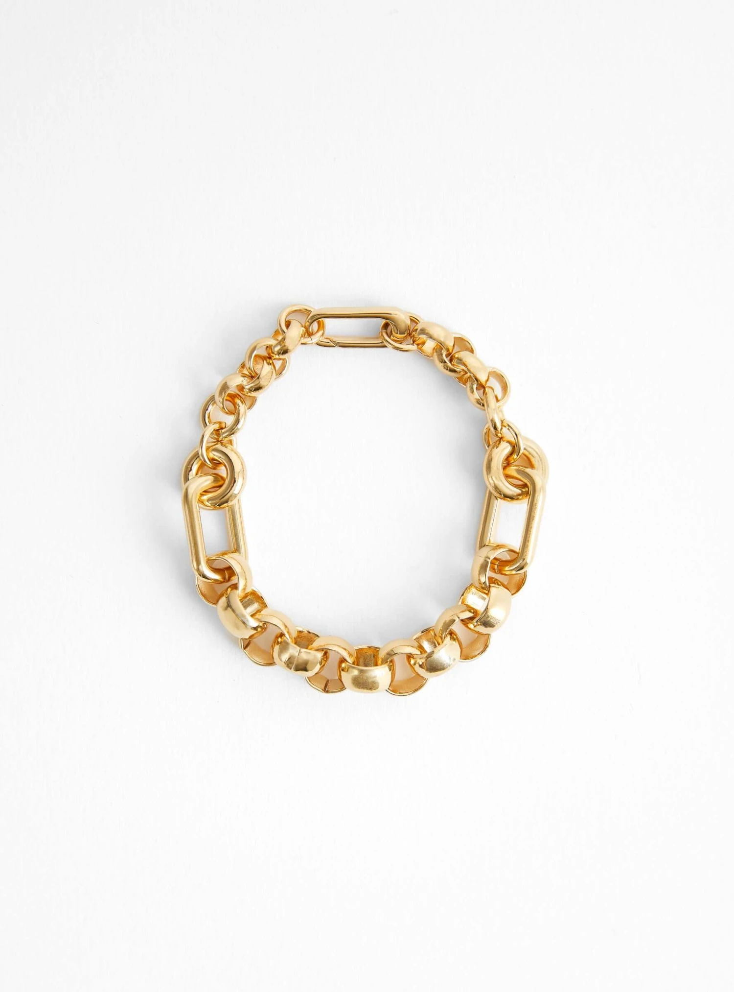The Pietra Bracelet from Laura Lombardi arrives in a 14k Gold plated brass. The patterned chain bracelet is composed of segmented chains and rectangular links. A chunky and intricately crafted bracelet that is strong enough to stand alone, or fit perfectly into a row of other bracelets.