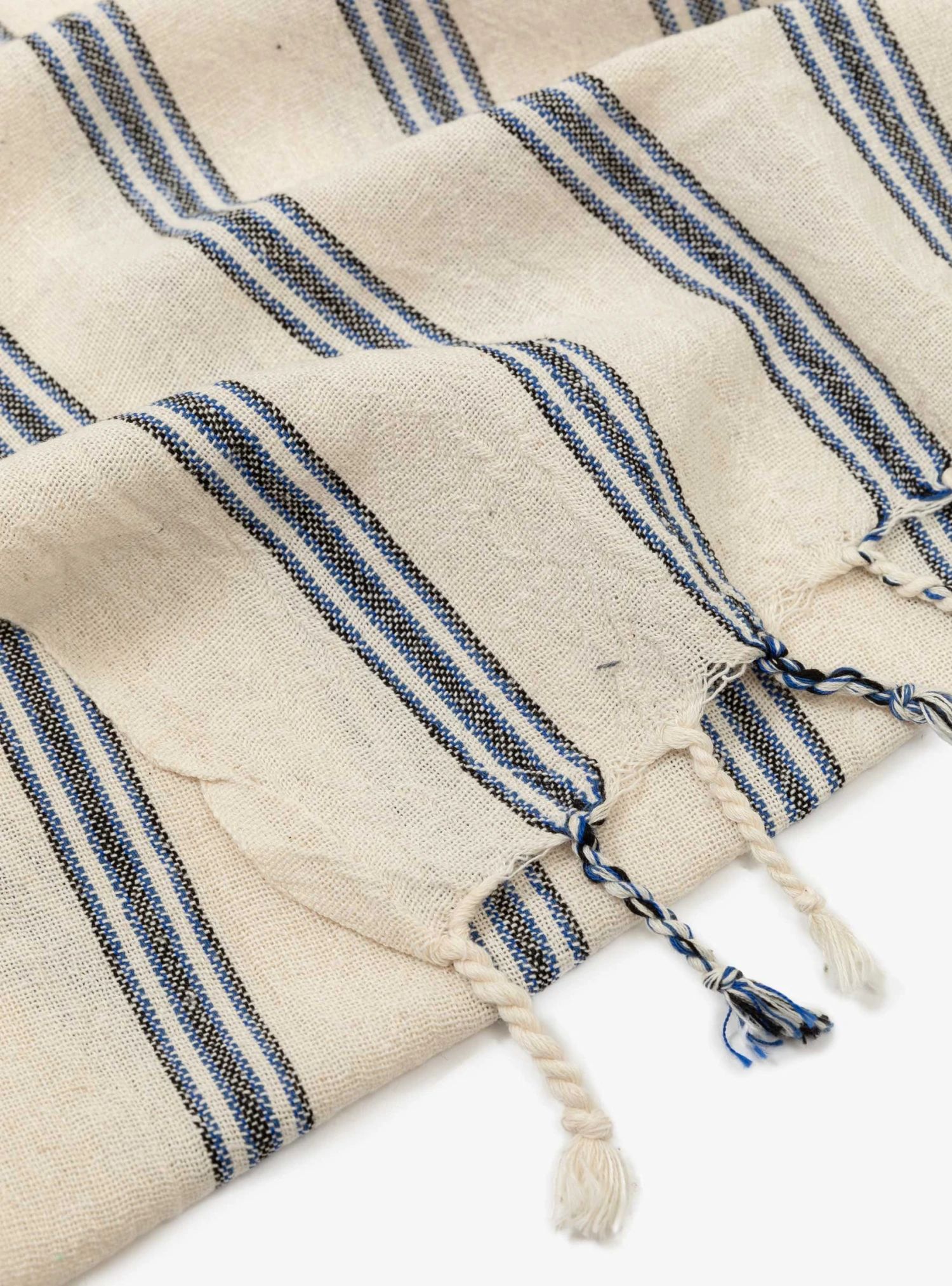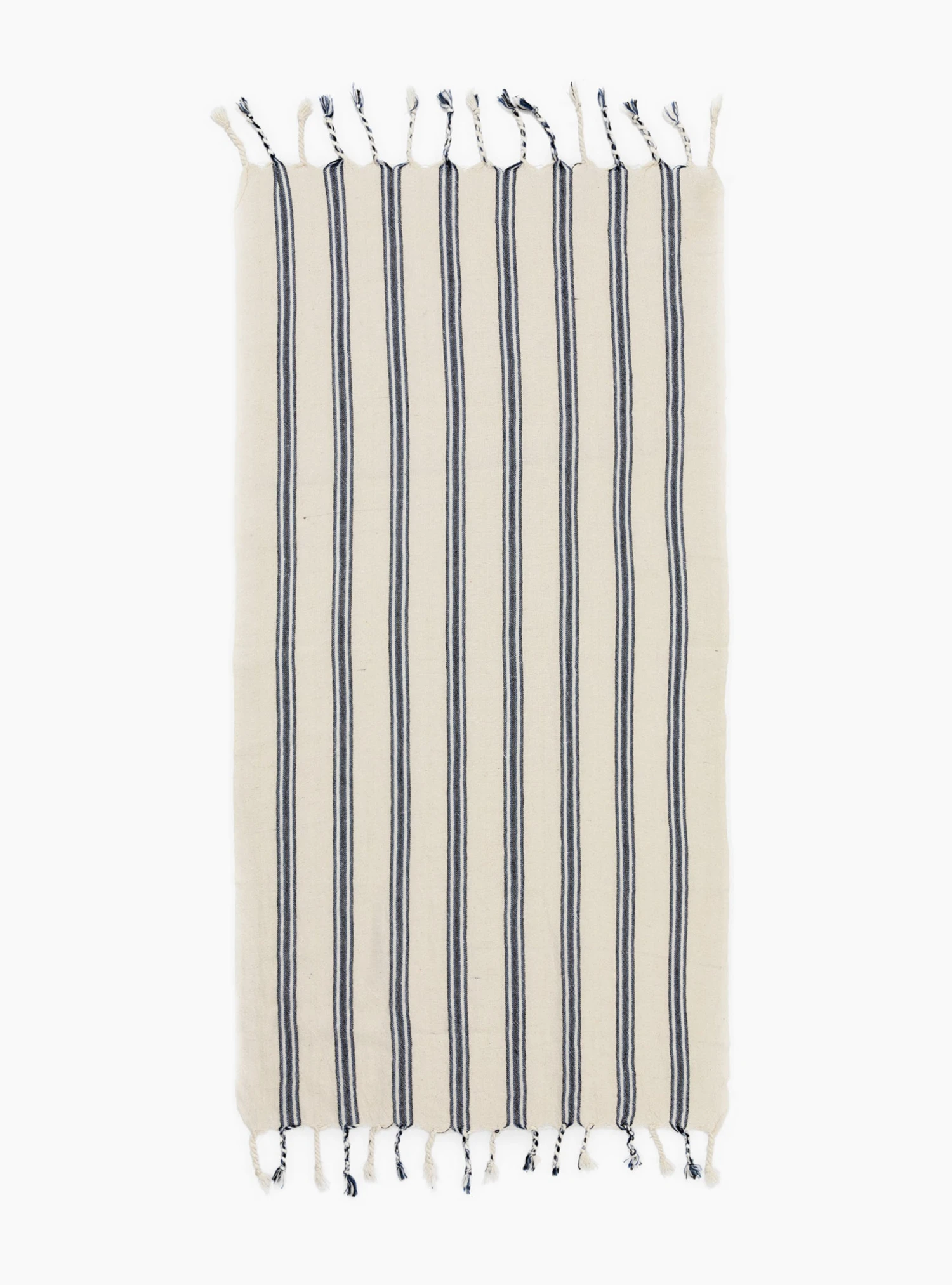 Featuring blue stripes, this Sapphire hand towel from Mizar & Alcor is inspired by the earthy textures found throughout the Mediterranean. It’s handwoven in Turkey on centuries-old looms using a quick-drying blend of linen and cotton and features braided tassel fringing trims the ends.