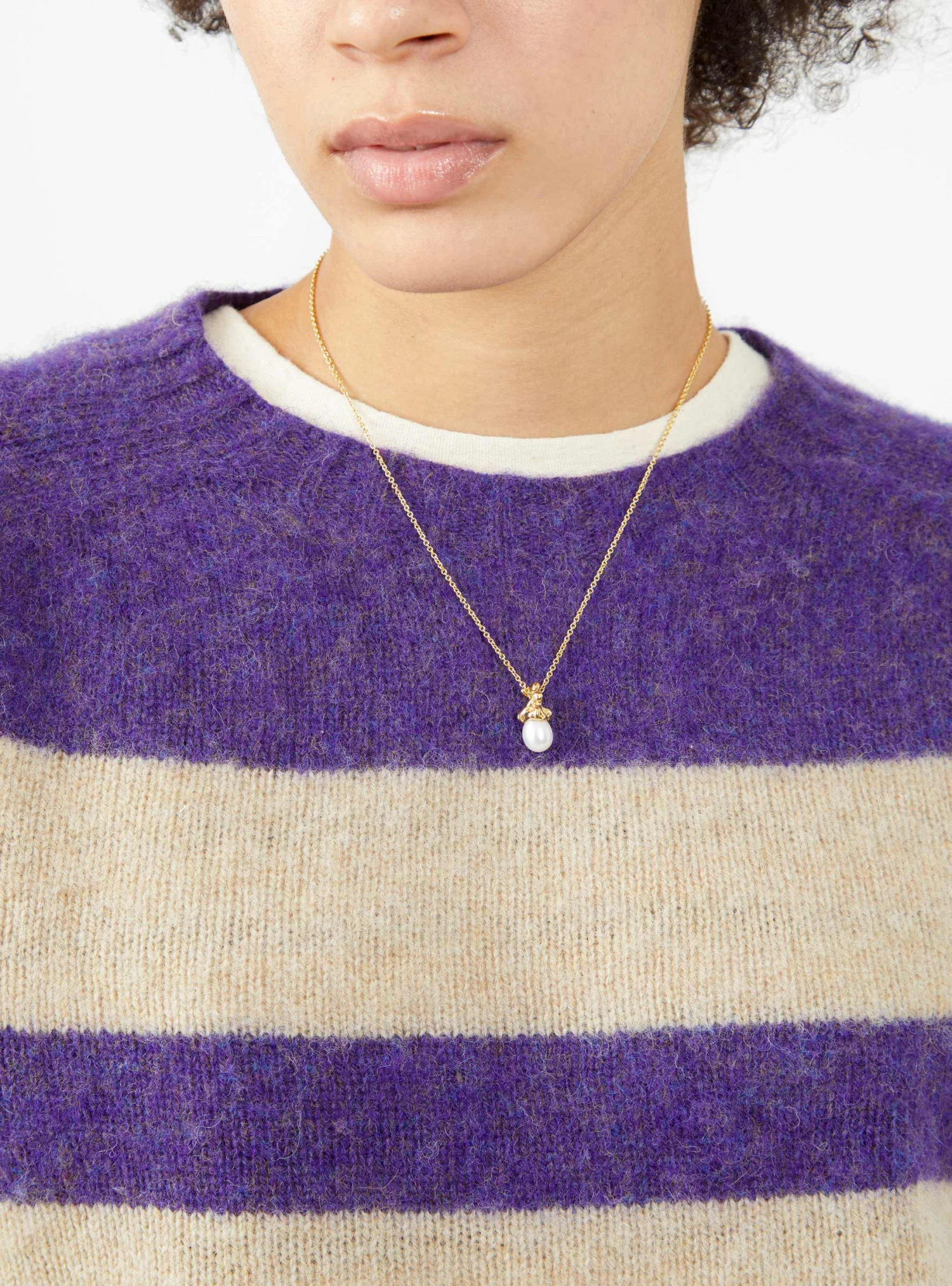 Suspending a shimmering freshwater pearl, this Sophia necklace from Faris is made by hand from 14kt gold-plated bronze at the label’s Seattle studio.