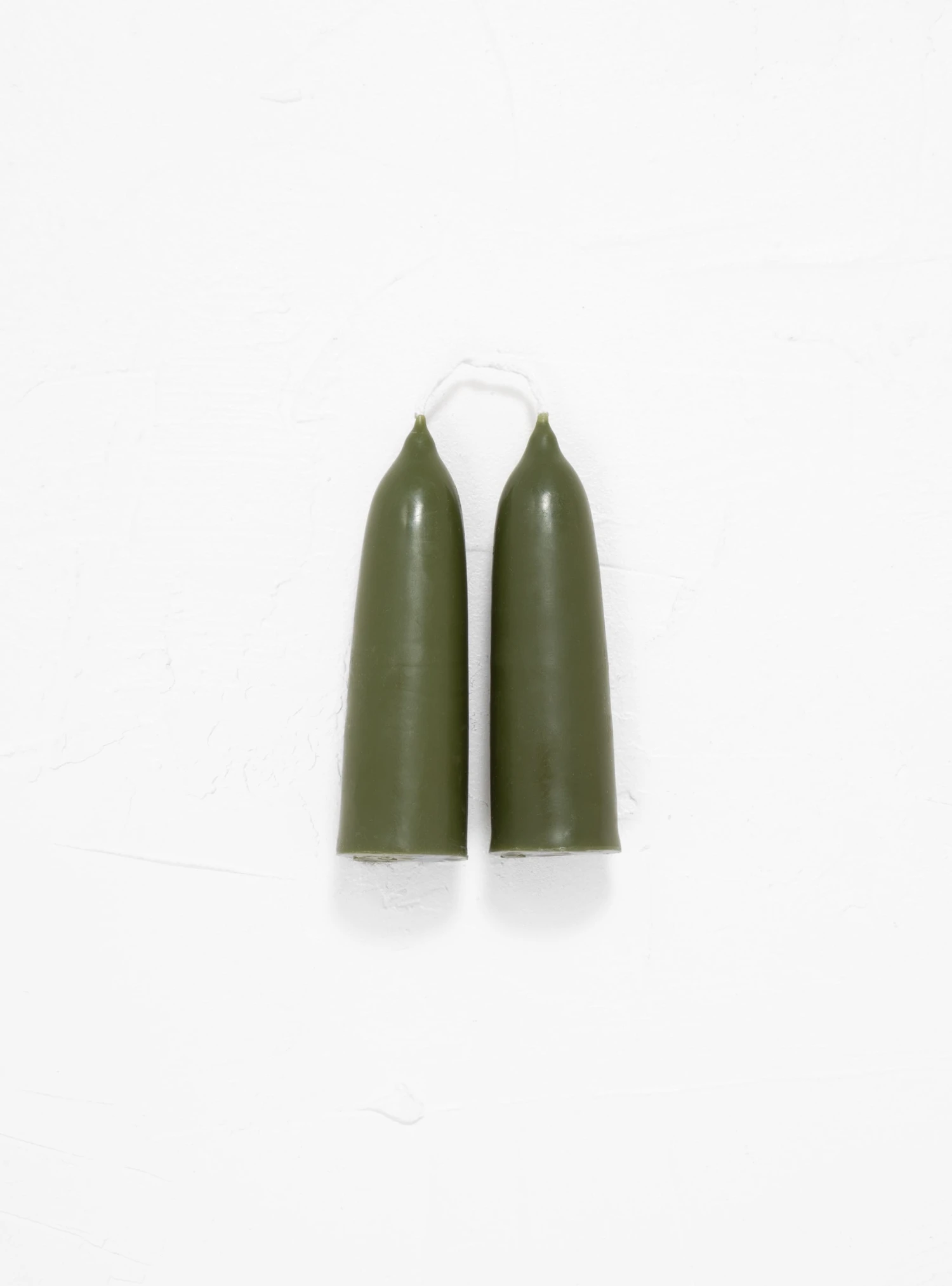 Wax Atelier employs traditional techniques to create this pair of nettle-green Stubby candles, made in the UK from pure beeswax with cotton wicks.