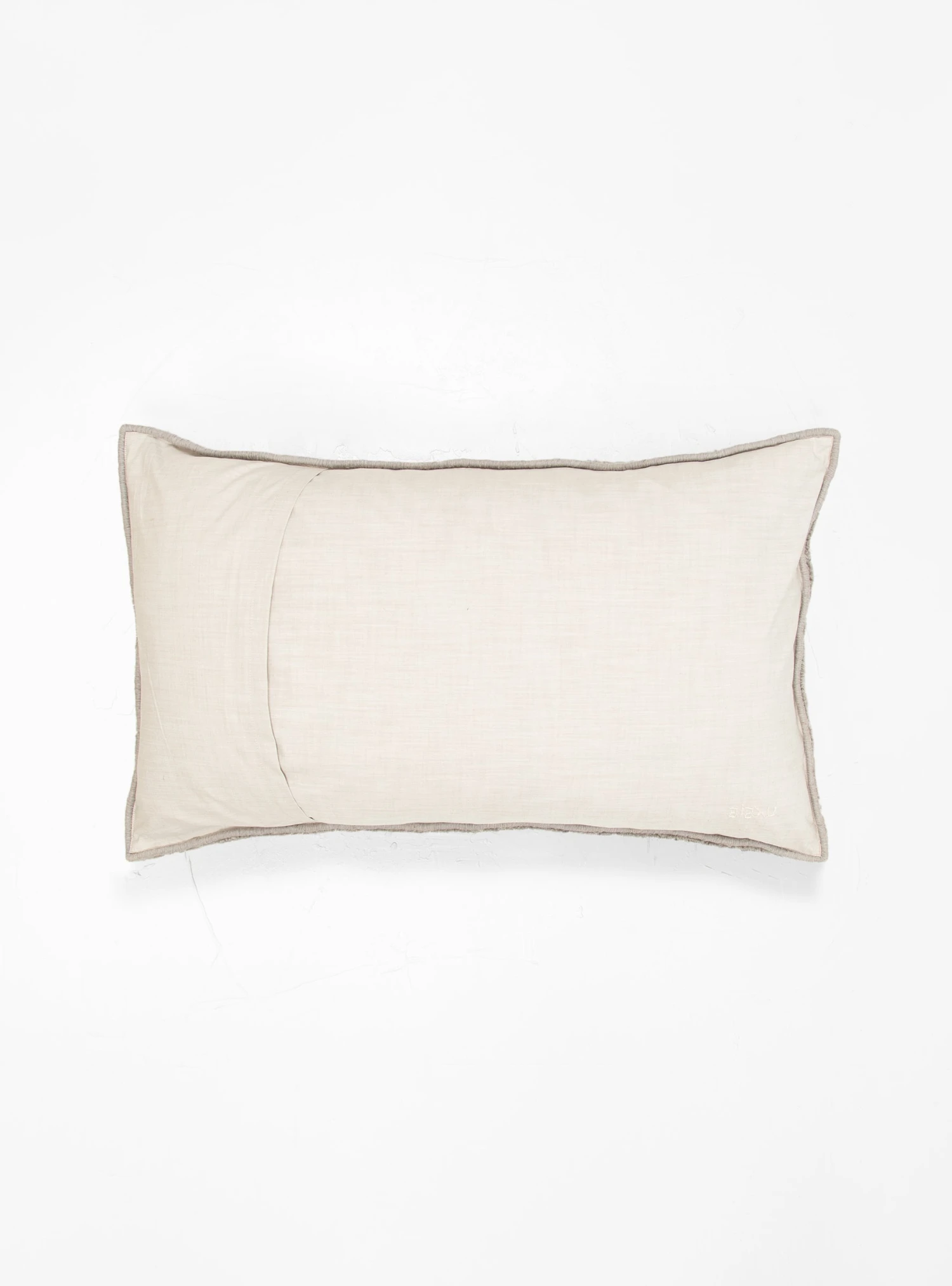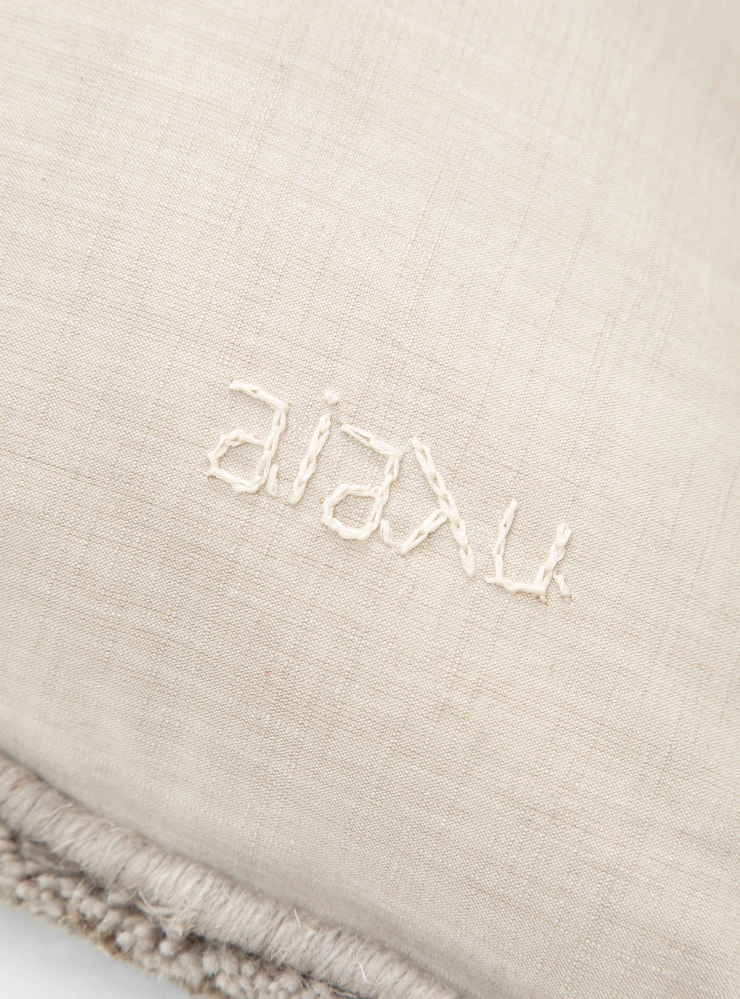 Featuring an abstract motif in natural shades of beige, grey and brown, this off-white Theo cushion from Aiayu is handmade from cashmere by artisans in Kathmandu, Nepal.