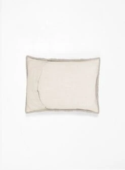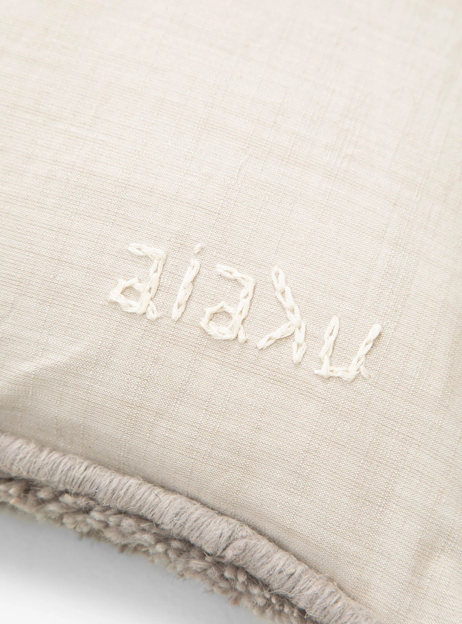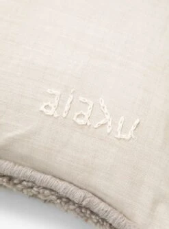 Featuring an abstract motif in natural shades of beige, grey and brown, this off-white Theo cushion from Aiayu is handmade from cashmere by artisans in Kathmandu, Nepal.