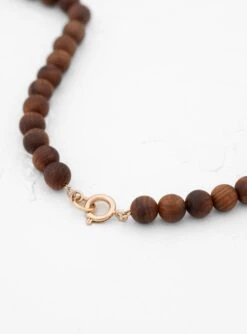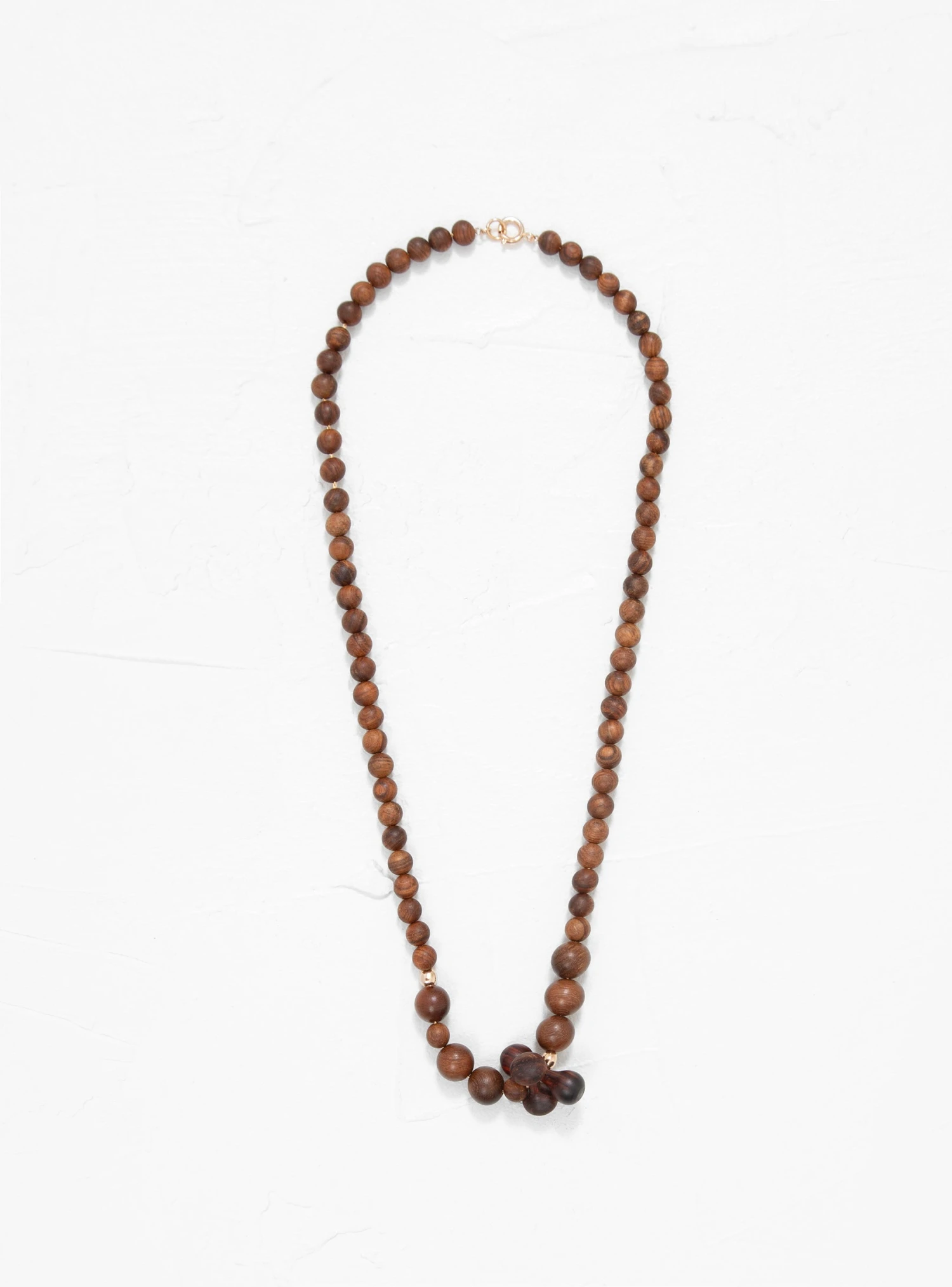 Helena Rohner works with natural materials to create this brown necklace, which is made in Spain from gold-plated brass and threaded with a combination of cocobolo and wengue wood beads, hand-turned in Madrid.
